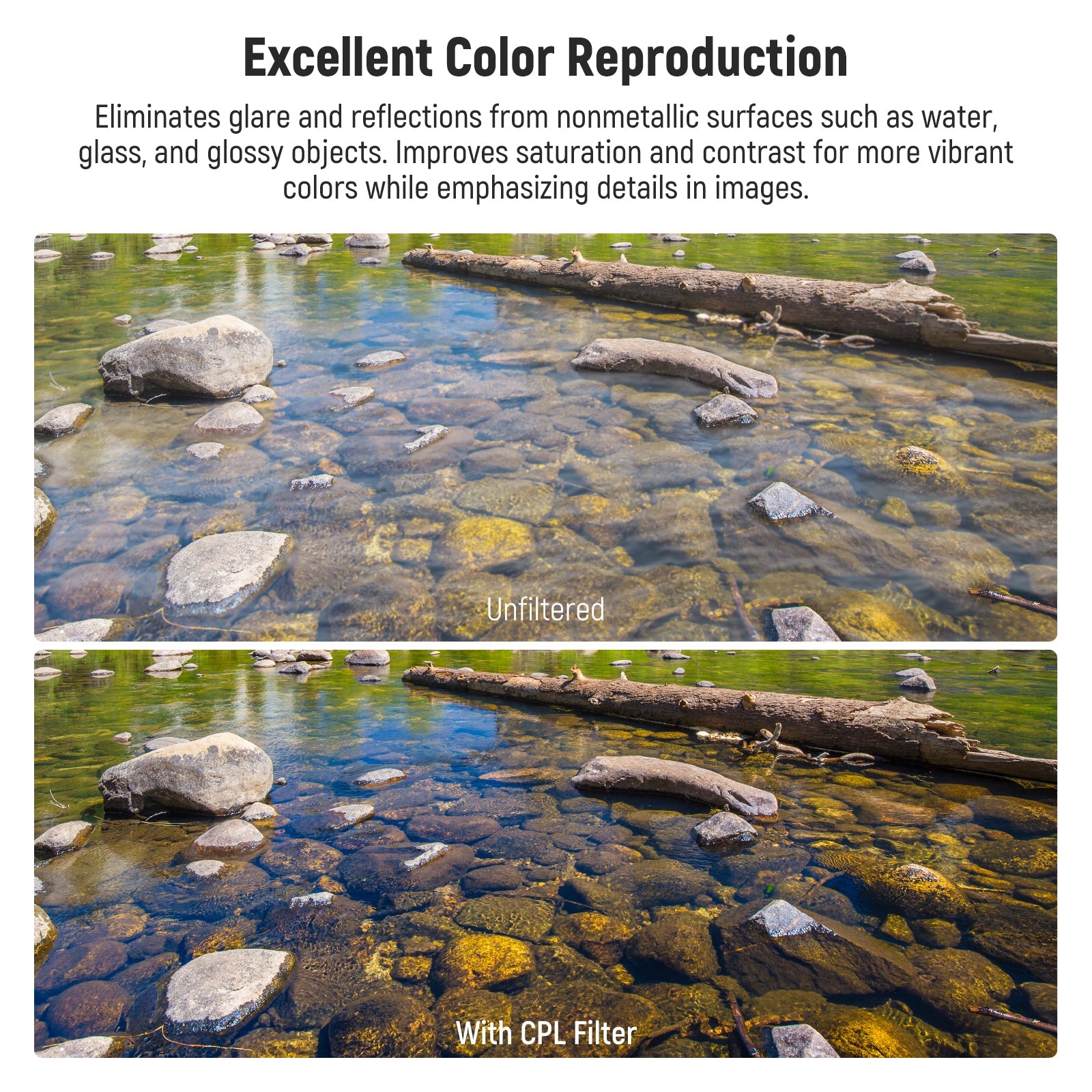 - Reduces Unwanted Reflection- Eliminates glare and reflections from nonmetallic surfaces such as water, glass, and glossy objects