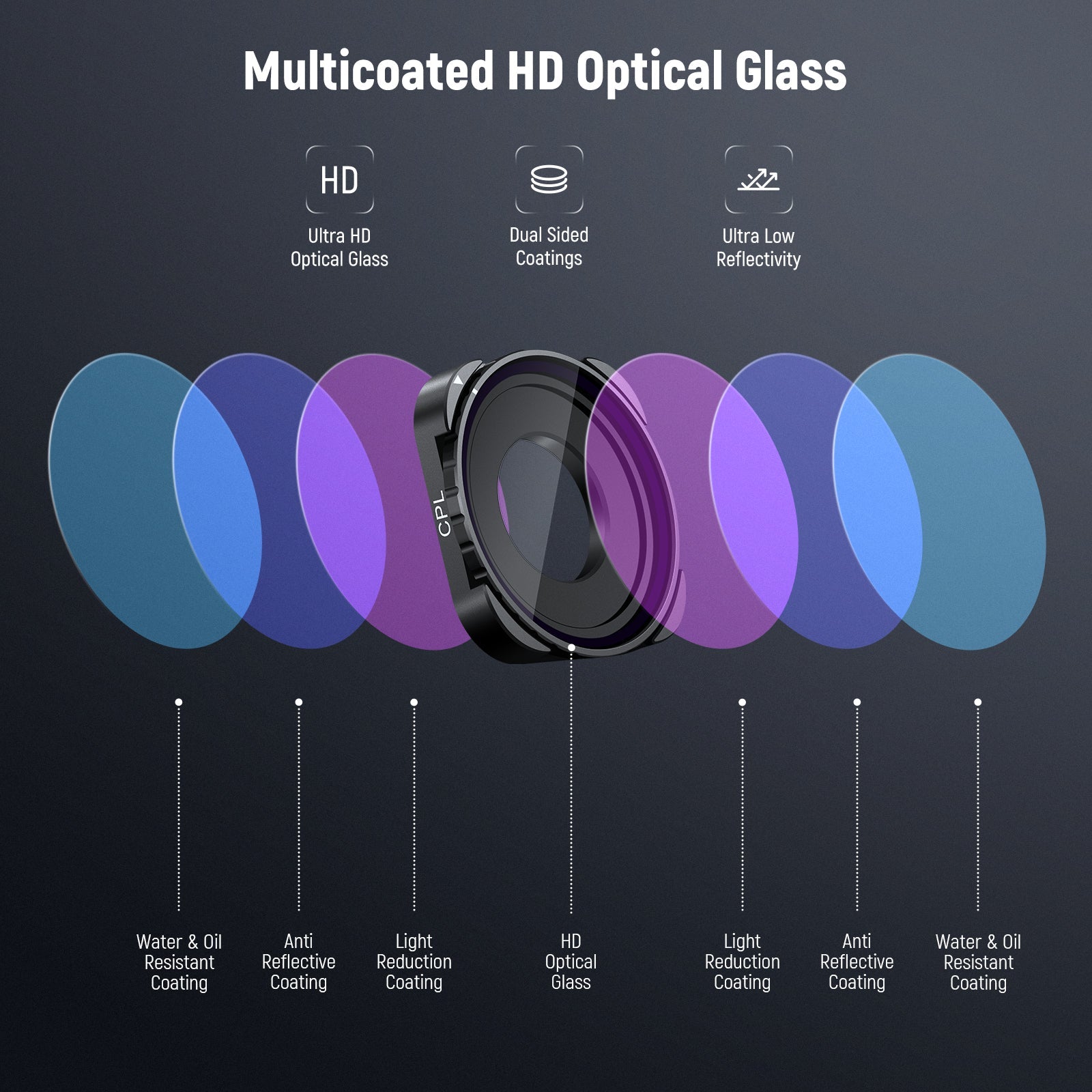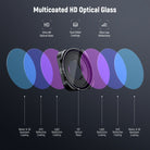 - Multicoated HD Optical Glass- HD optical glass delivers exceptional clarity and color fidelity. Multiple coatings on both sides are resistant to water, fingerprints, smudges, and scratches, ensuring high durability and easy cleaning during outdoor shooting