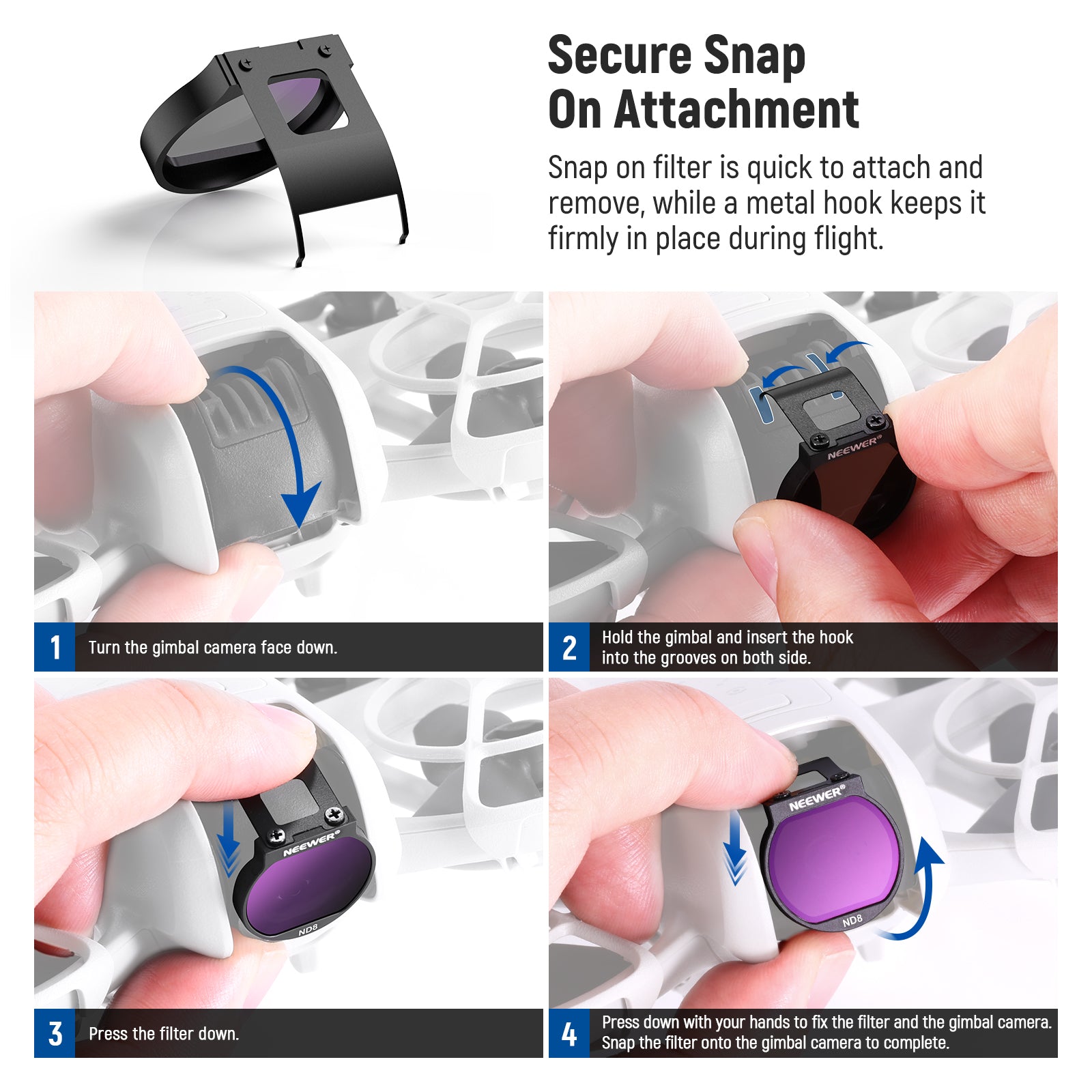 - Secure Snap On Attachment- Snap on design ensures quick attachment and removal, while a hook keeps the filter firmly in place during flight. The slim and lightweight metal frame prevents vignetting and will not affect the use of the gimbal protector