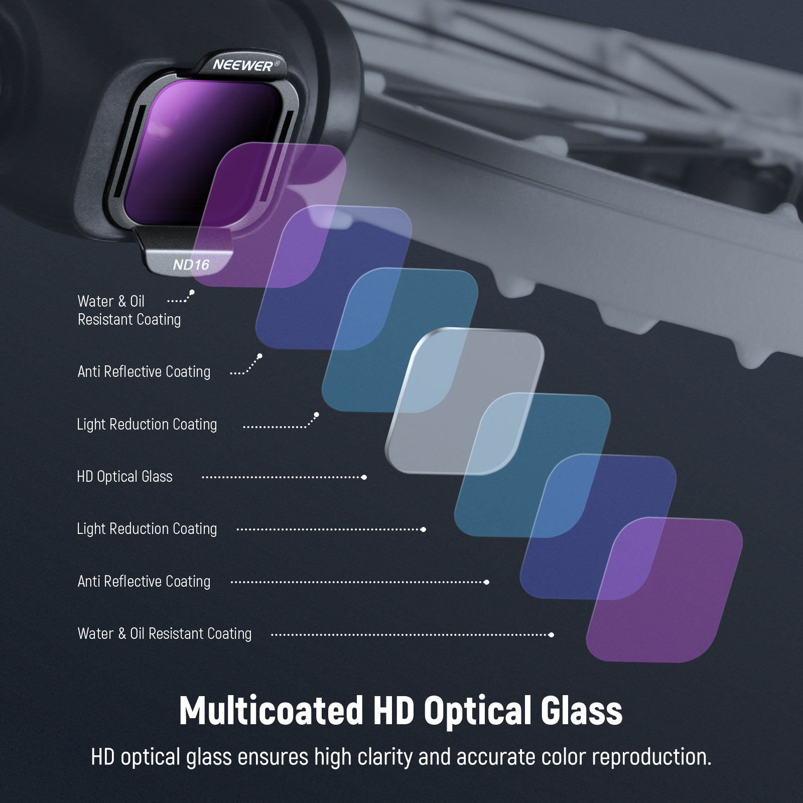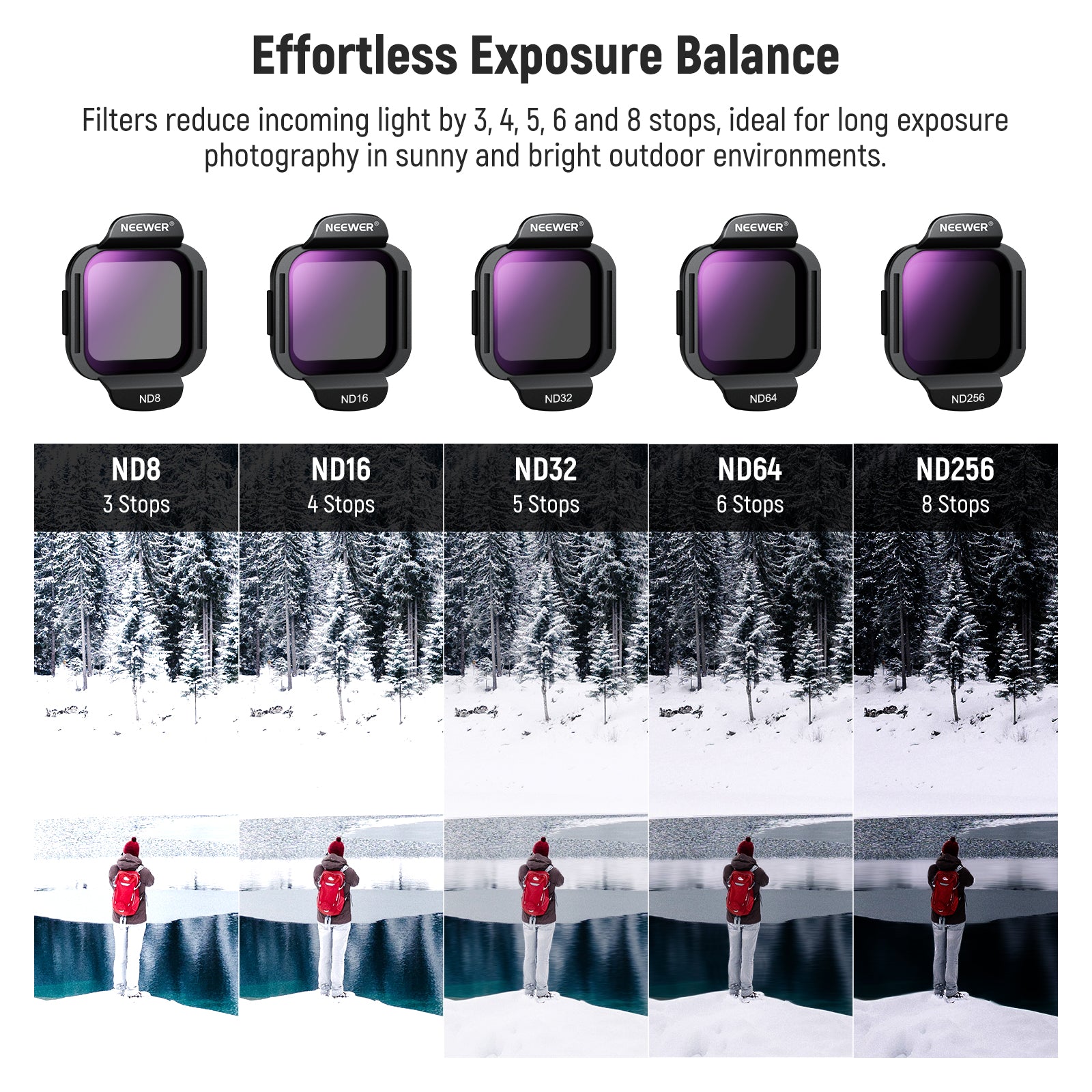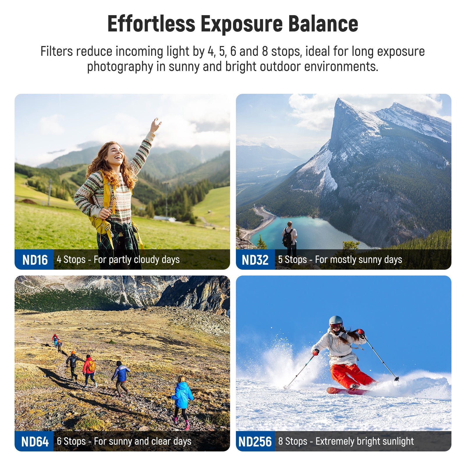 - Combination of ND & PL Filters- Four ND/PL filters (ND8/PL, ND16/PL, ND32/PL, ND64/PL) reduce light 3, 4, 5, and 6 stops respectively. They combine ND and circular polarizer effects, enable precise exposure control and improve color, contrast, and detail in your images while effectively reducing glare and reflections. By simplifying your workflow, they are ideal for outdoor video recording and landscape photography