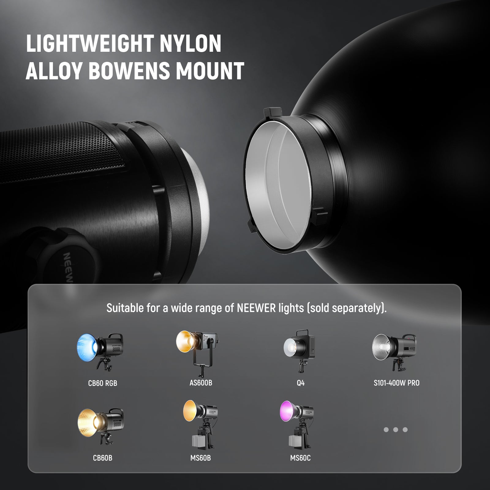 - Standard Bowens Mount- NEEWER FR26 strobe light reflector is equipped with a Bowens mount for flexibly attaching a wide array of Bowens photography lights, compatible with Profoto compatible with Godox compatible with Aputure NEEWER studio strobes, flashes, speedlites, monolights, adapter brackets, etc. The precision design ensures a secure fit, allowing for easy mounting and quick removal