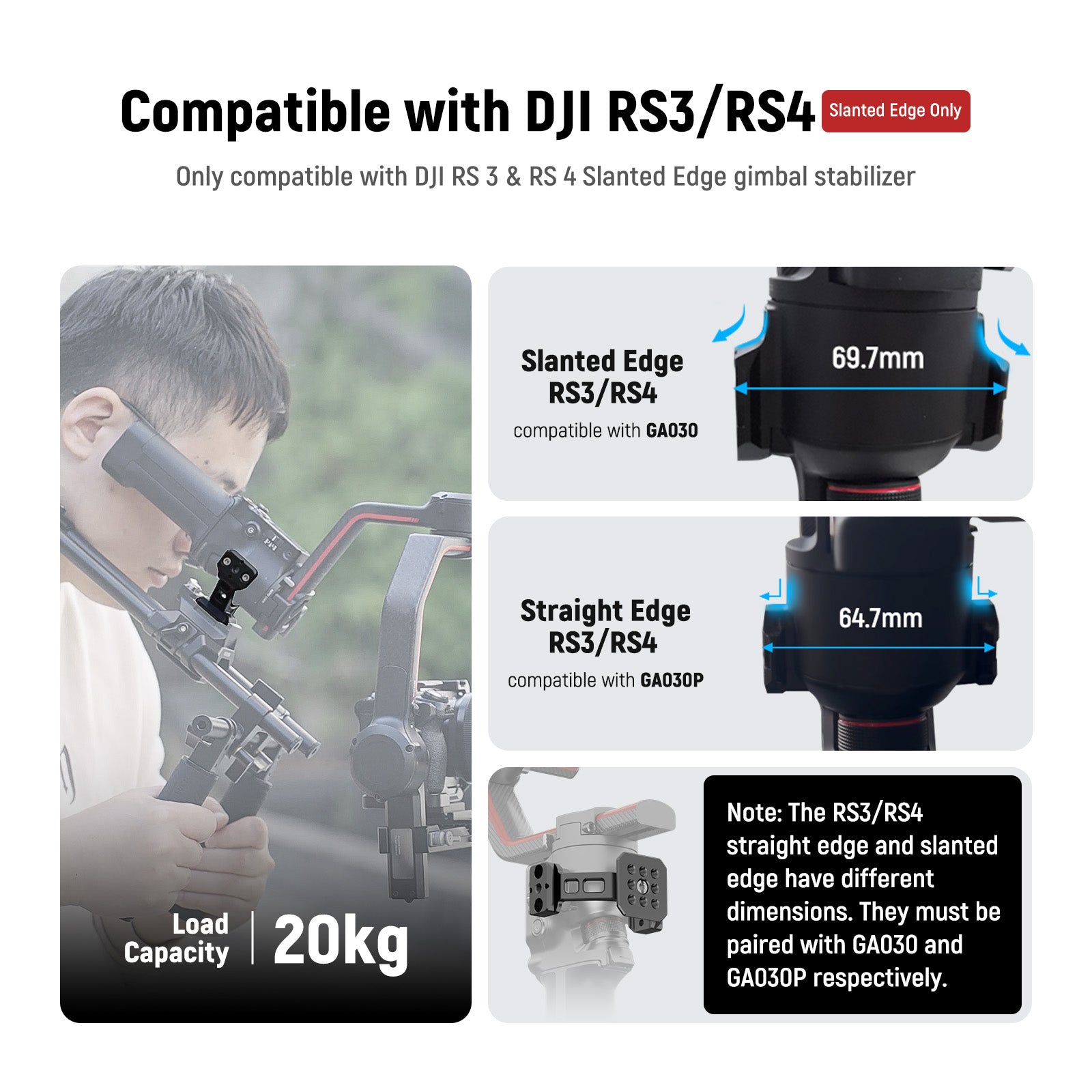 - Compatible with Slanted Edge DJI RS3/RS4- Due to version and size differences, the GA030 is only compatible with RS3/RS4 models that have slanted NATO ports and a 69.7mm width. If your RS3/RS4 has straight NATO ports and a 64.7mm width, please choose the GA030P instead. This mount adapter features two NATO rails and a QR plate compatible with Arca Swiss