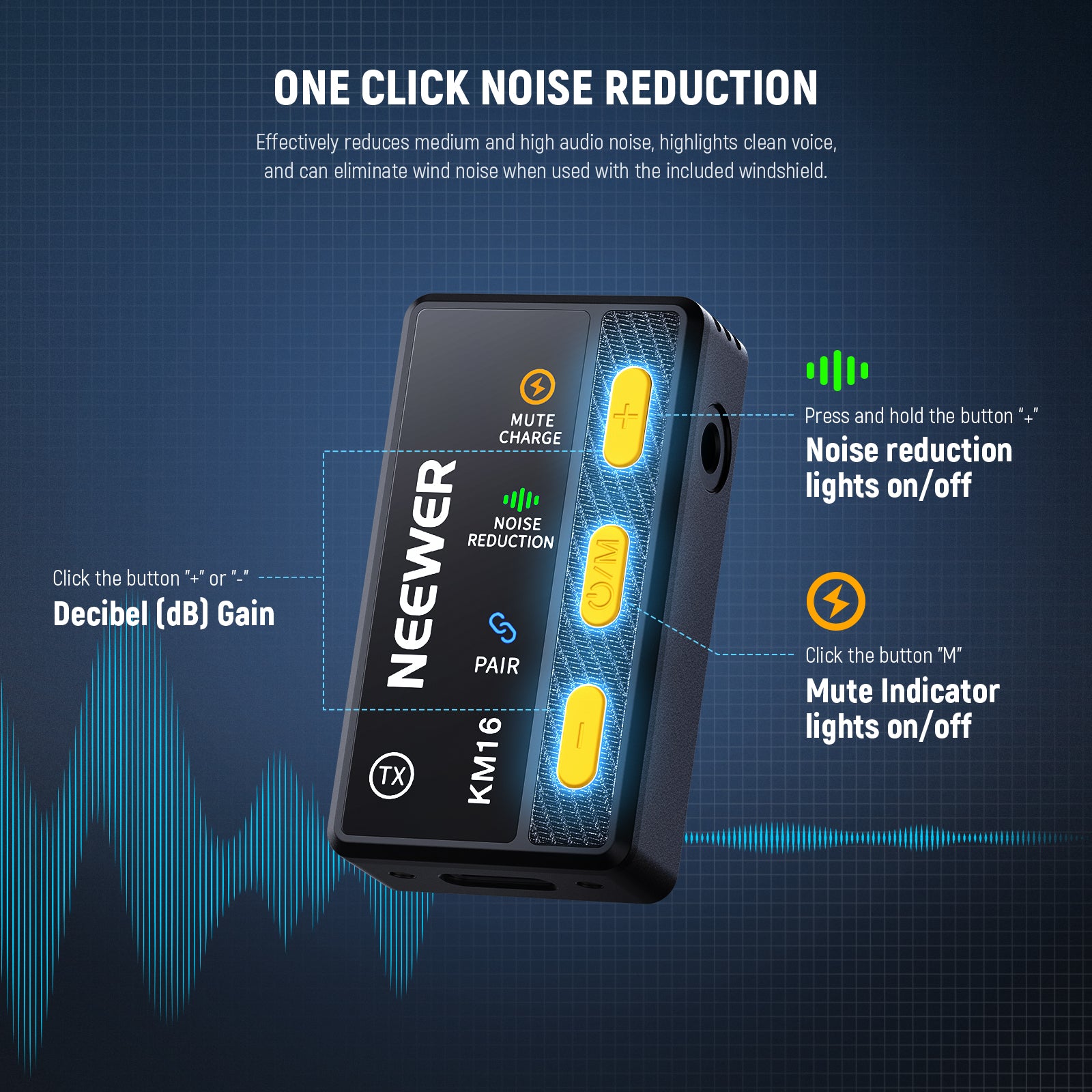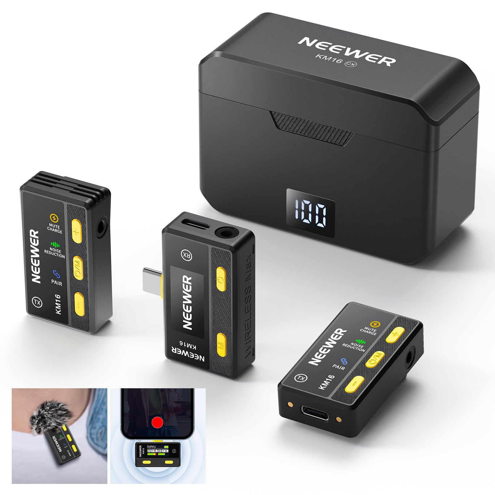 - 12H Battery Life- Distinct from traditional microphones, the KM16 comes with its own charging case. The charging case can fully charge the RX/TX and they can last for 6 hours after being fully charged. The total battery life of the product is up to 12 hours. There is a power display on the charging case, and the RX has a display and a 3.5mm monitoring port. Compact and potable charging case supports charging anytime, anywhere