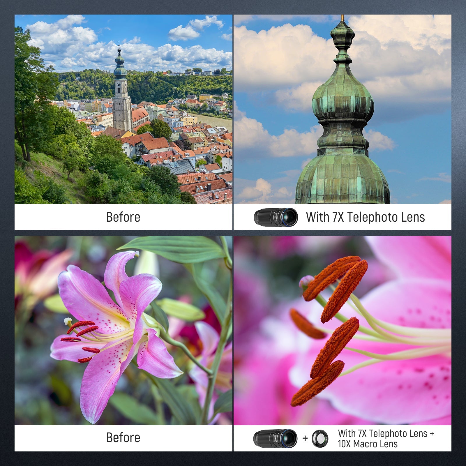 - 7X Zoom on Main Camera- The telephoto lens attaches to the phone's main camera and offers 7x optical magnification. HD glass with 15 elements in 12 groups delivers sharp and vibrant images. Turn the focus ring the easily adjust focus and clearly capture subjects from 16ft/5m away, ideal for wildlife, sports, and landscapes