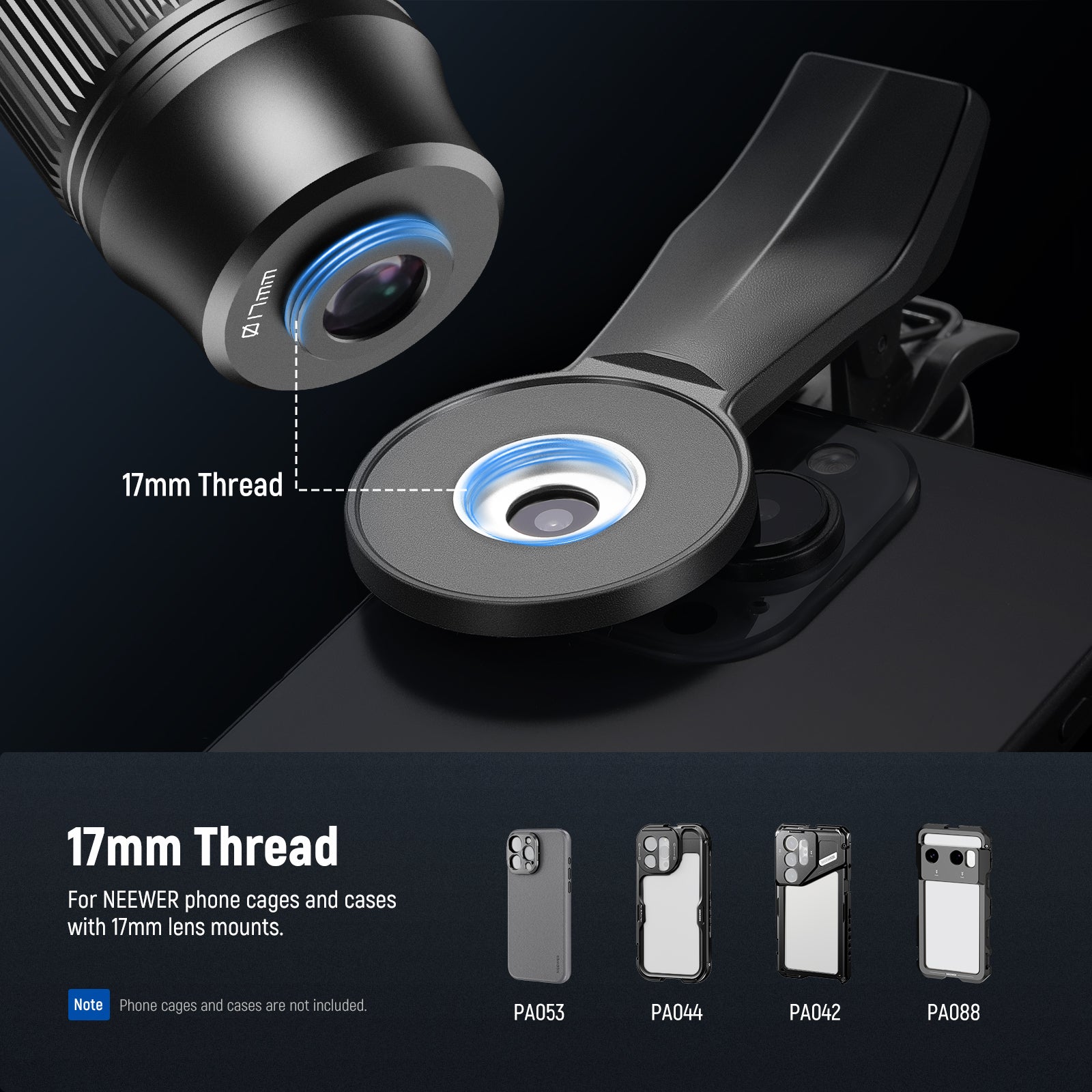 - Universal Phone Lens Clip- The included clip securely mounts the lens to most smartphones, compatible with iPhone 16 Pro Max, iPhone 15 14 13 Pro Max, Samsung Galaxy S25 Ultra Android, and more. The lens can directly mount to NEEWER phone cages, phone cases, and backplates with 17mm threads for lens attachment