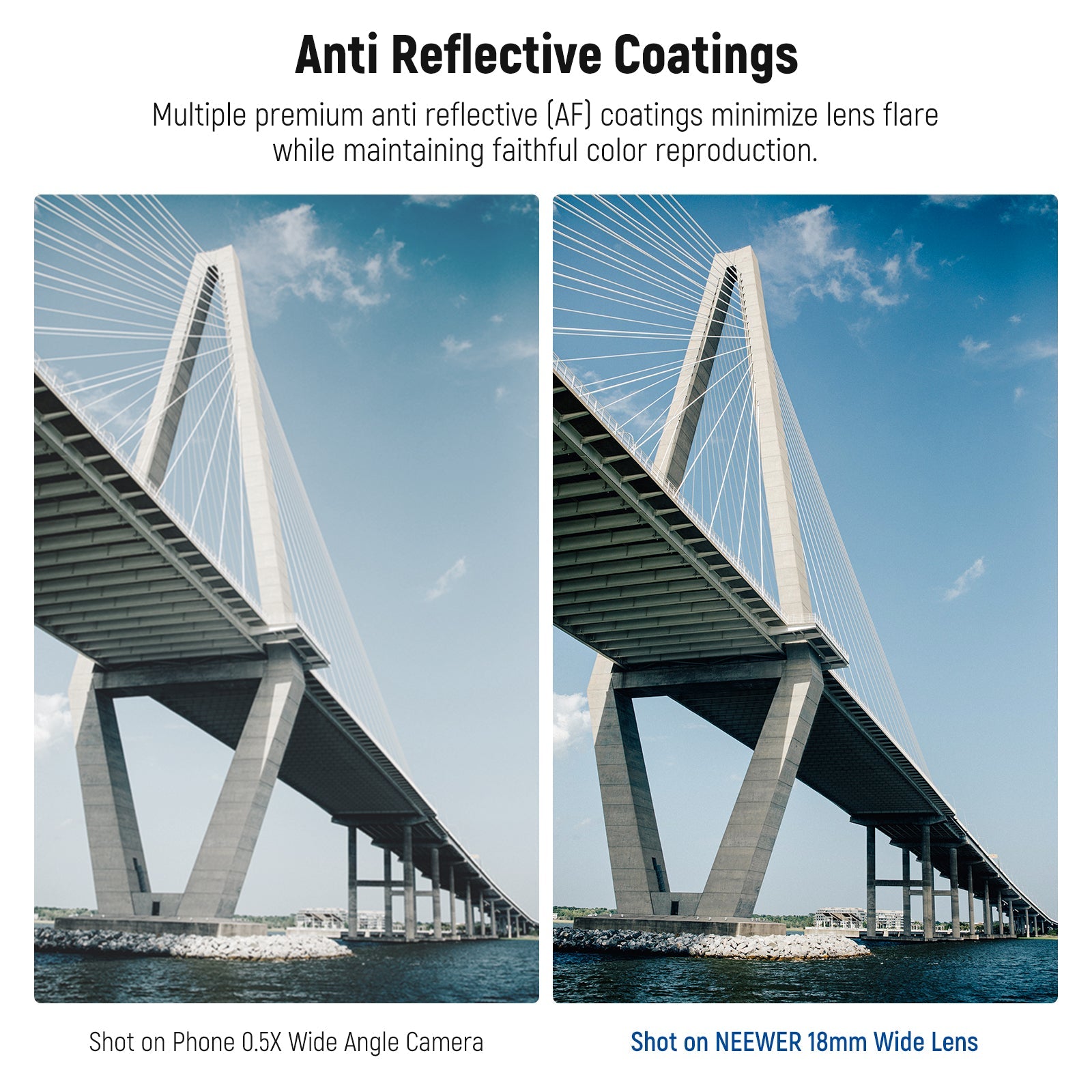 • 18mm Wide Angle Lens- Used on your phone's main camera, this 0.75X 18mm wide angle lens helps you capture clear and sharp photos with a 100° expansive field of view (FOV) and creative edge distortion, perfect for wildlife, natural landscapes, cityscapes, concerts, group portraits, and more