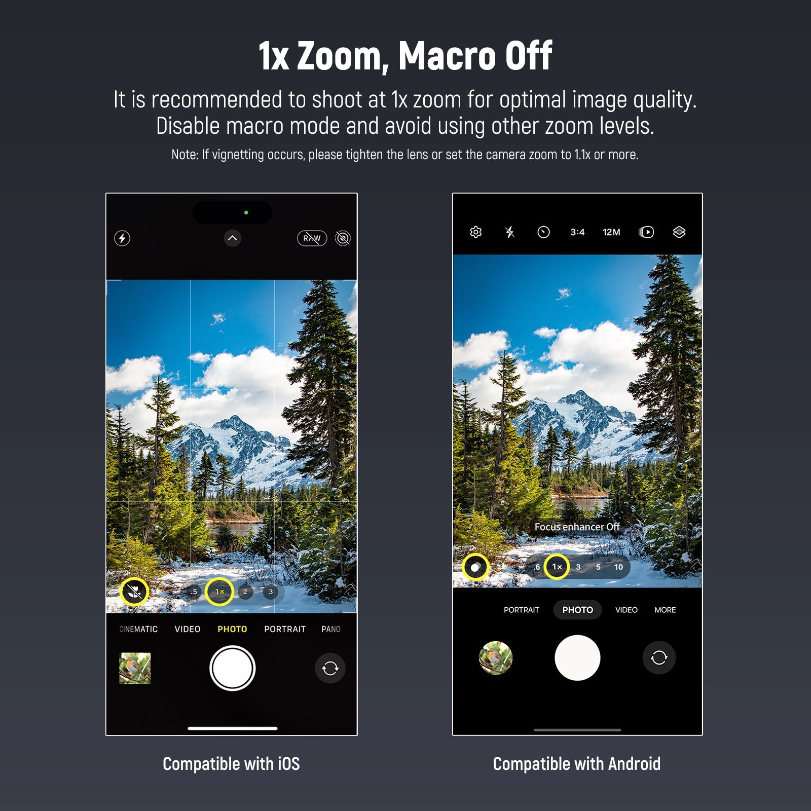 • Lightweight & Sturdy Build- This lightweight lens attachment boasts an aluminum alloy shell. Note: Before use, please clean the main and adjacent cameras. If vignetting occurs, please tighten the lens and set the camera zoom to 1.1x or more