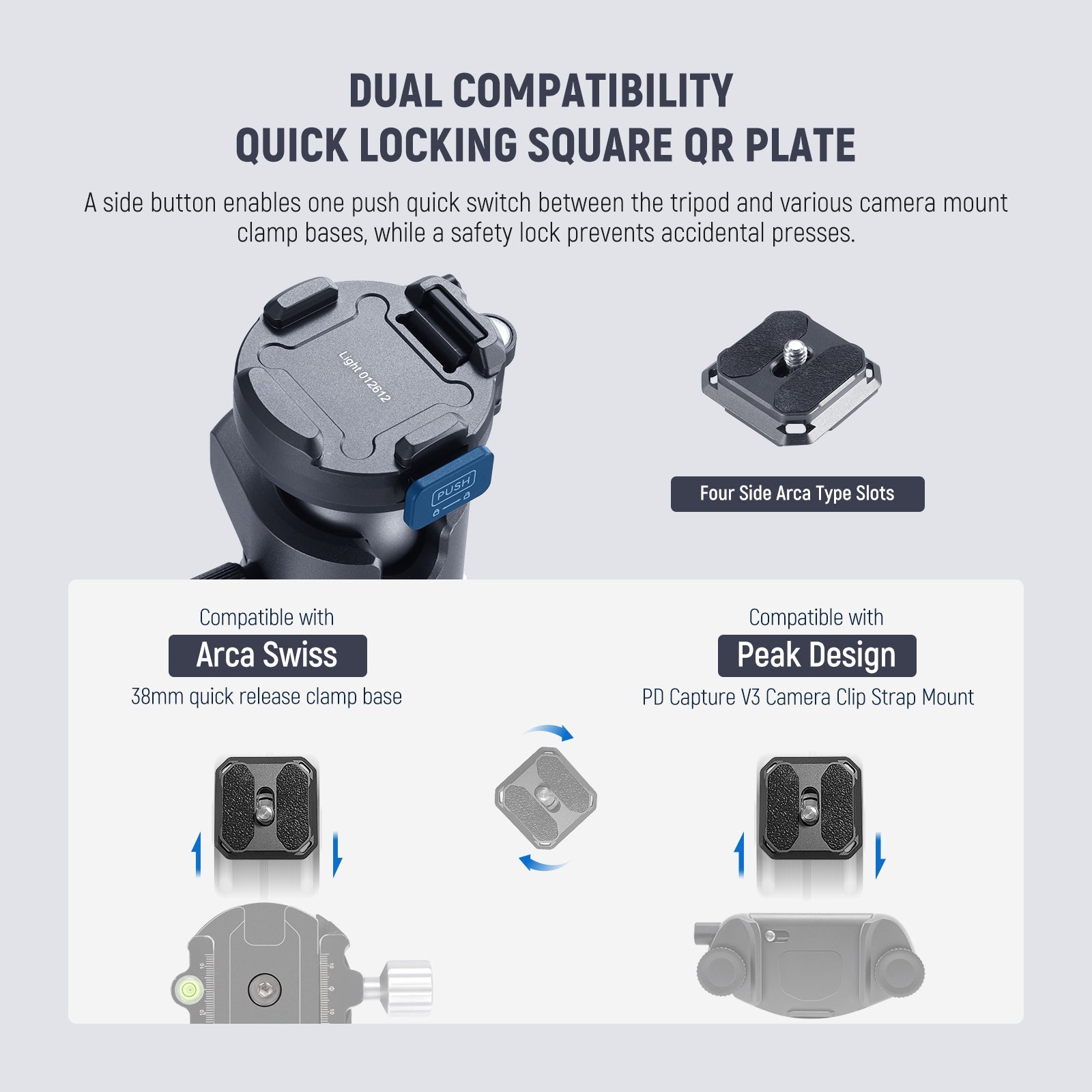 - Quick Release Arca Type QR Plate- The Arca type quick release plate is also compatible with the Peak Design Capture Clip V3. A side button enables one press attachment and removal of your camera, allowing for quick transitions between the tripod and other camera mount clamp bases. A safety lock is incorporated to prevent accidental activation of the release button. Note: QR clamp is compatible only with PD QR plates and included Arca type plates