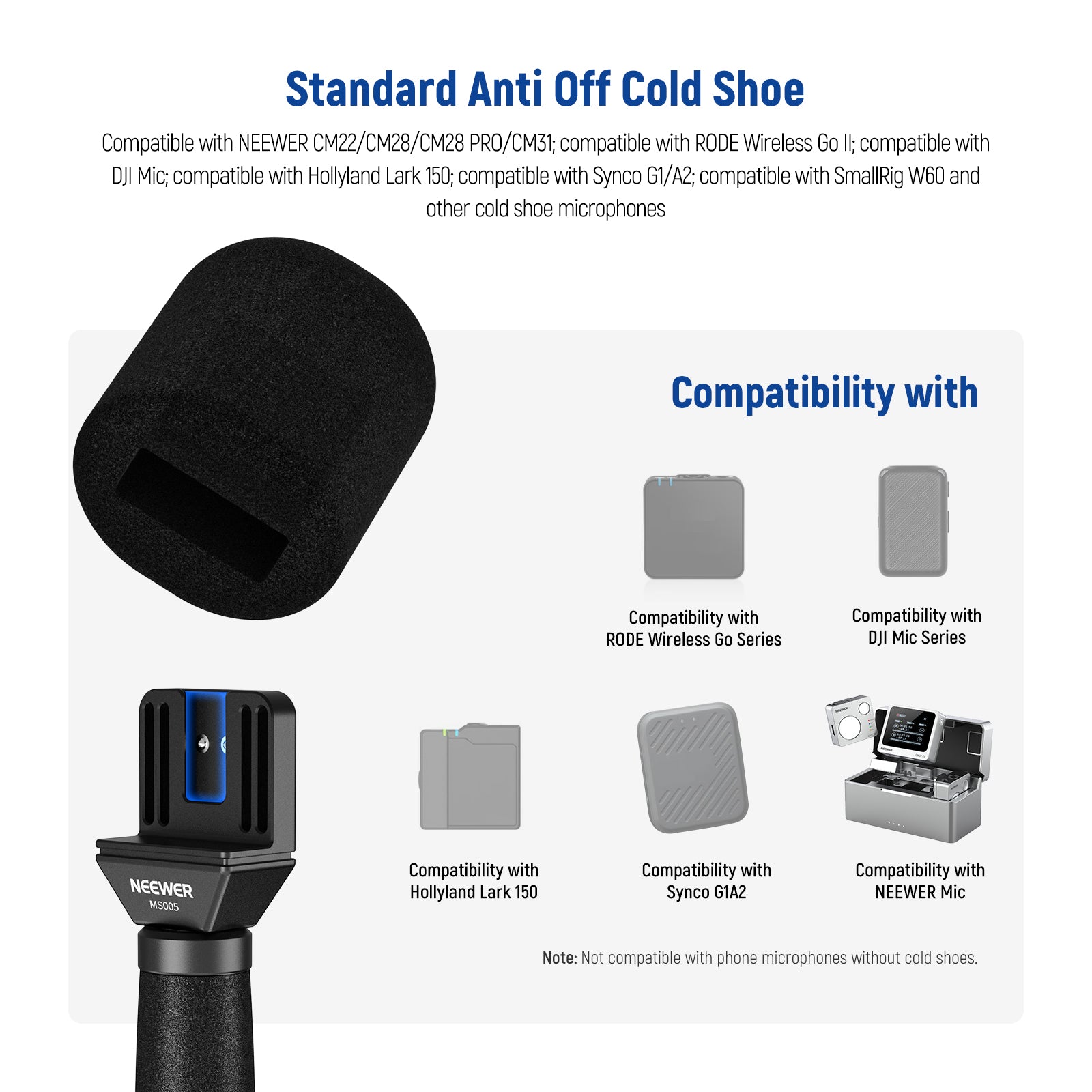 - Standard Anti Off Cold Shoe- This mic handle features an anti off cold shoe that vertically mounts your wireless lavalier and prevents it from dropping. Compatible with NEEWER CM31; compatible with RODE Wireless Go II 2; compatible with DJI Mic; compatible with Hollyland Lark 150; compatible with Synco G1/A2; compatible with SmallRig W60 and other clip on microphones with cold shoes
