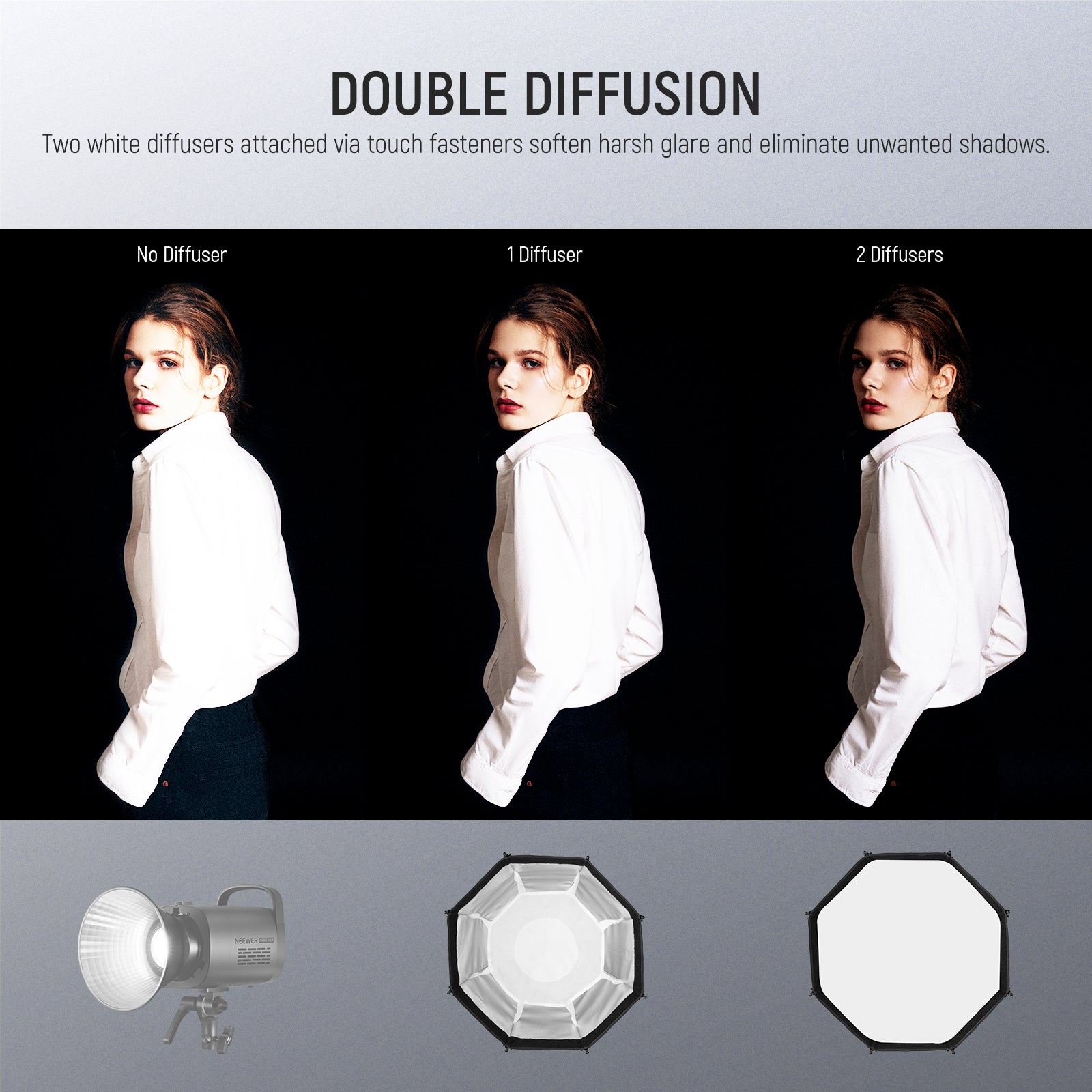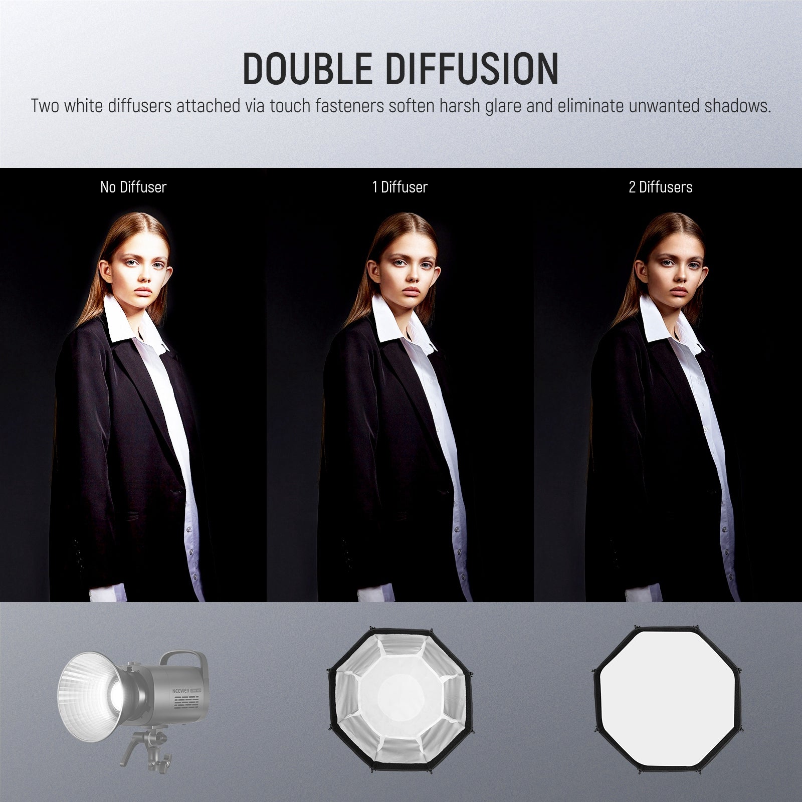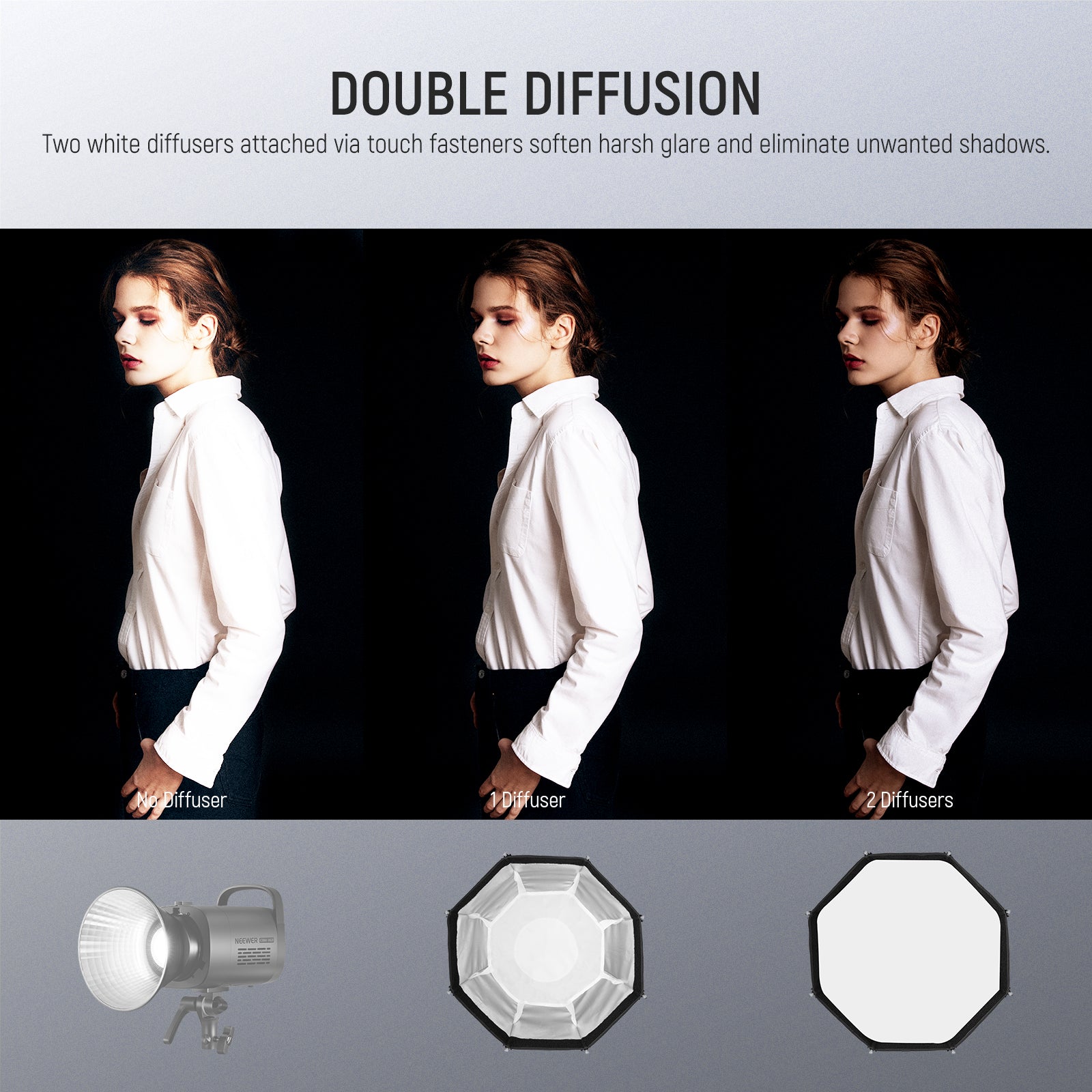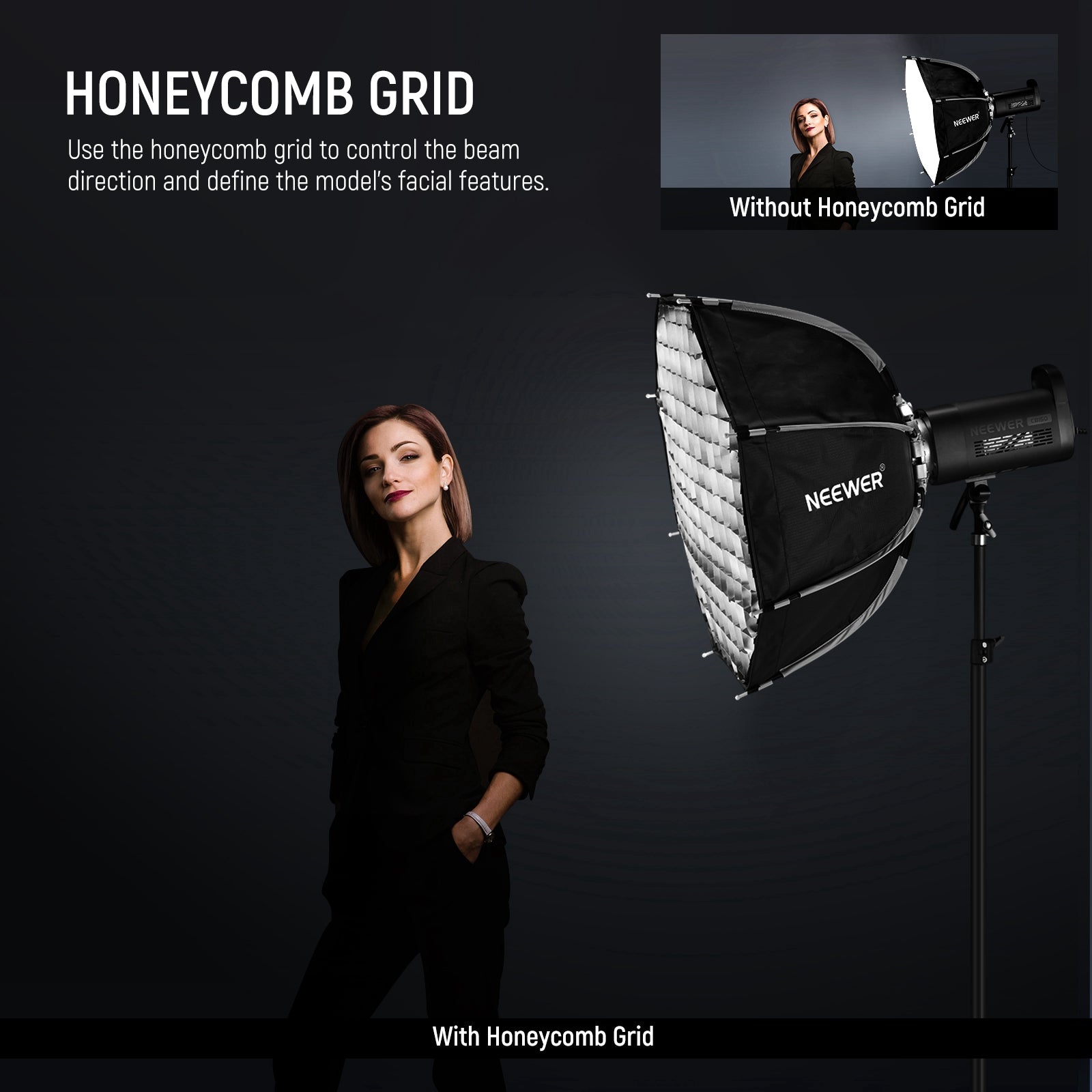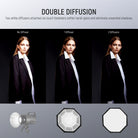 - Honeycomb Grid & Diffusers- The honeycomb grid can make the light shape confined and directional, giving a dramatic and expressive light effect to define the model’s facial structure. Two quality diffusers can be combined or used separately for different effects