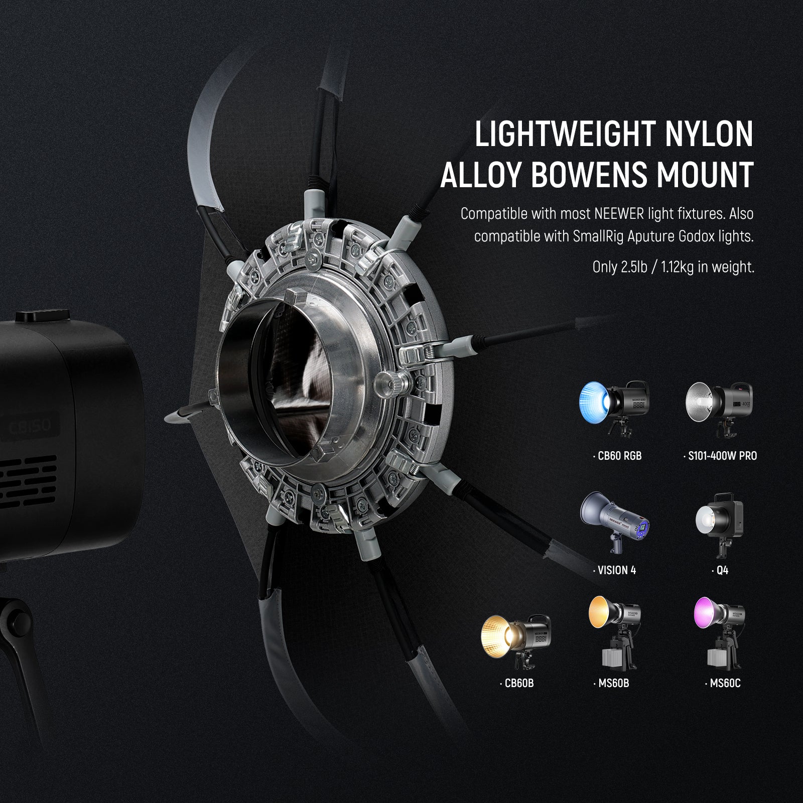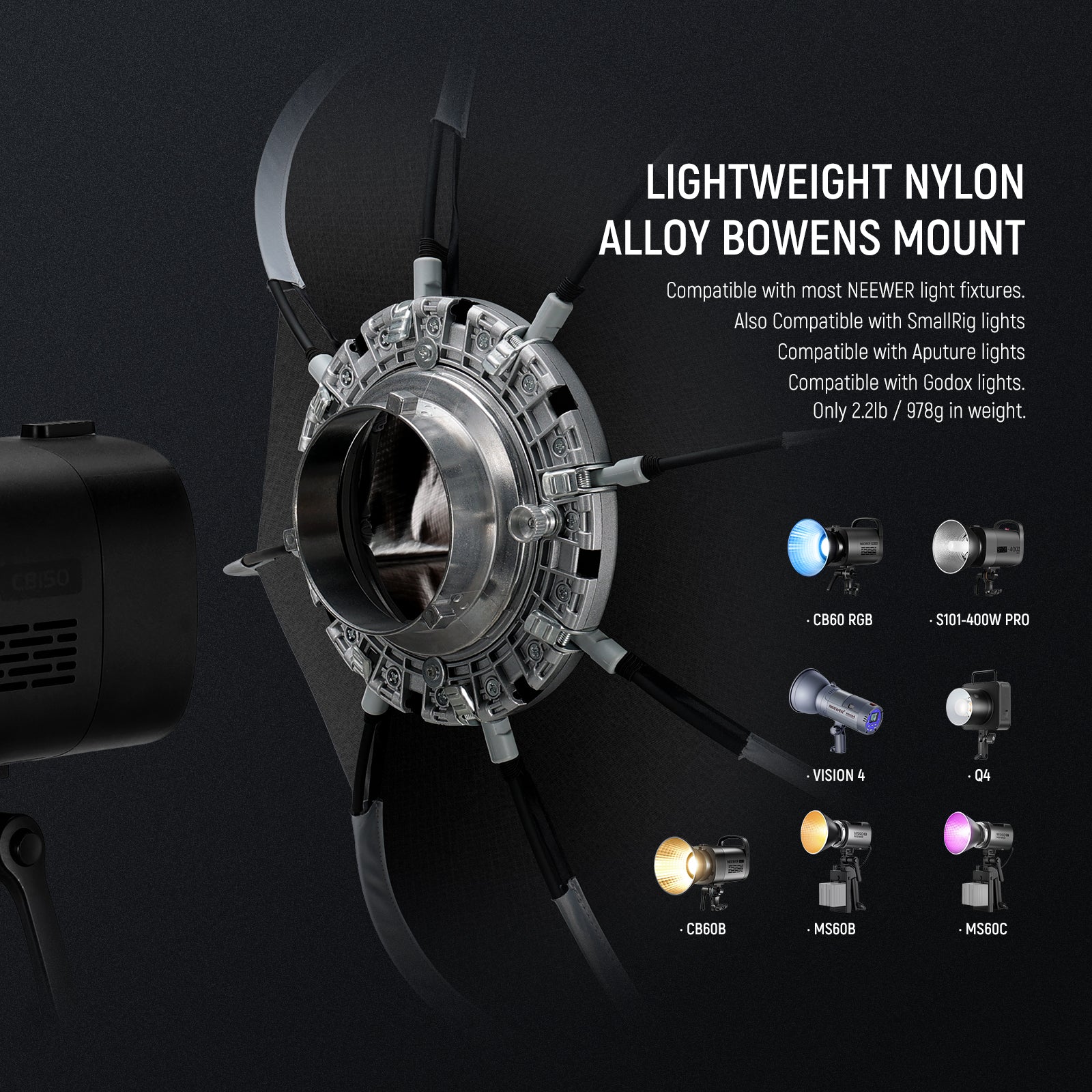 - Standard Bowens Mount- With the standard Bowens mount, this softbox can attach to numerous NEEWER monolights and continuous video lights and strobe flash monolights, such as CB60, CB100, CB150, CB60B, RGB CB60, CB200B, MS60B, MS60C, MS150B, S101-300W/400W Pro, Vision 4, Q4. Compatible with SmallRig compatible with Aputure 120d Godox sl60w, etc