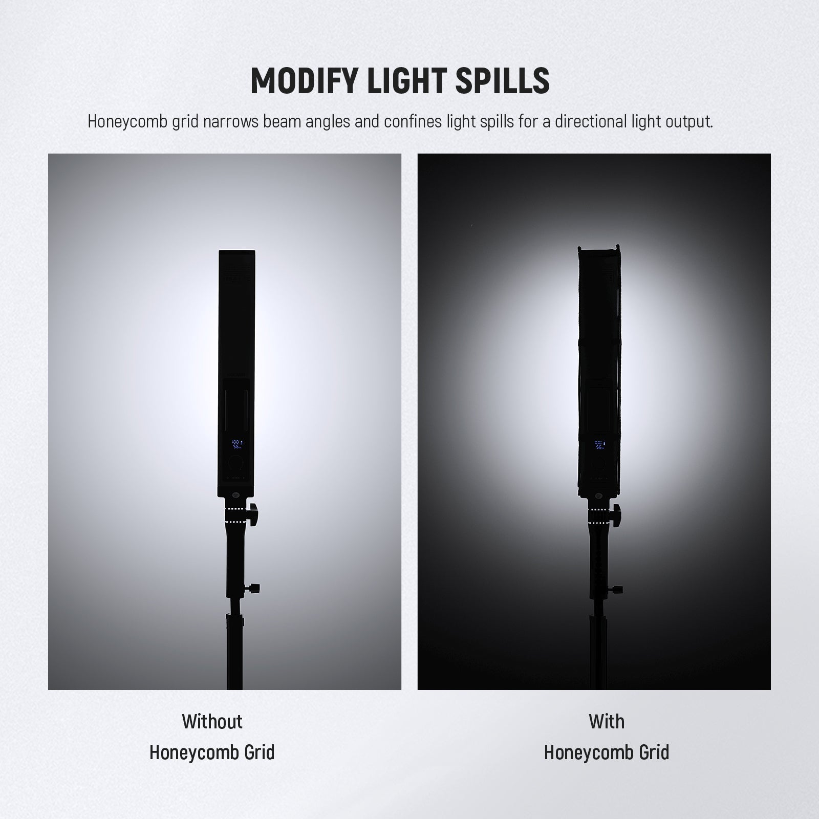 - Manipulate Light Directions- The eggcrate grid can narrow beam angles, confine light spills, and generate dramatic contrast in pictures and videos