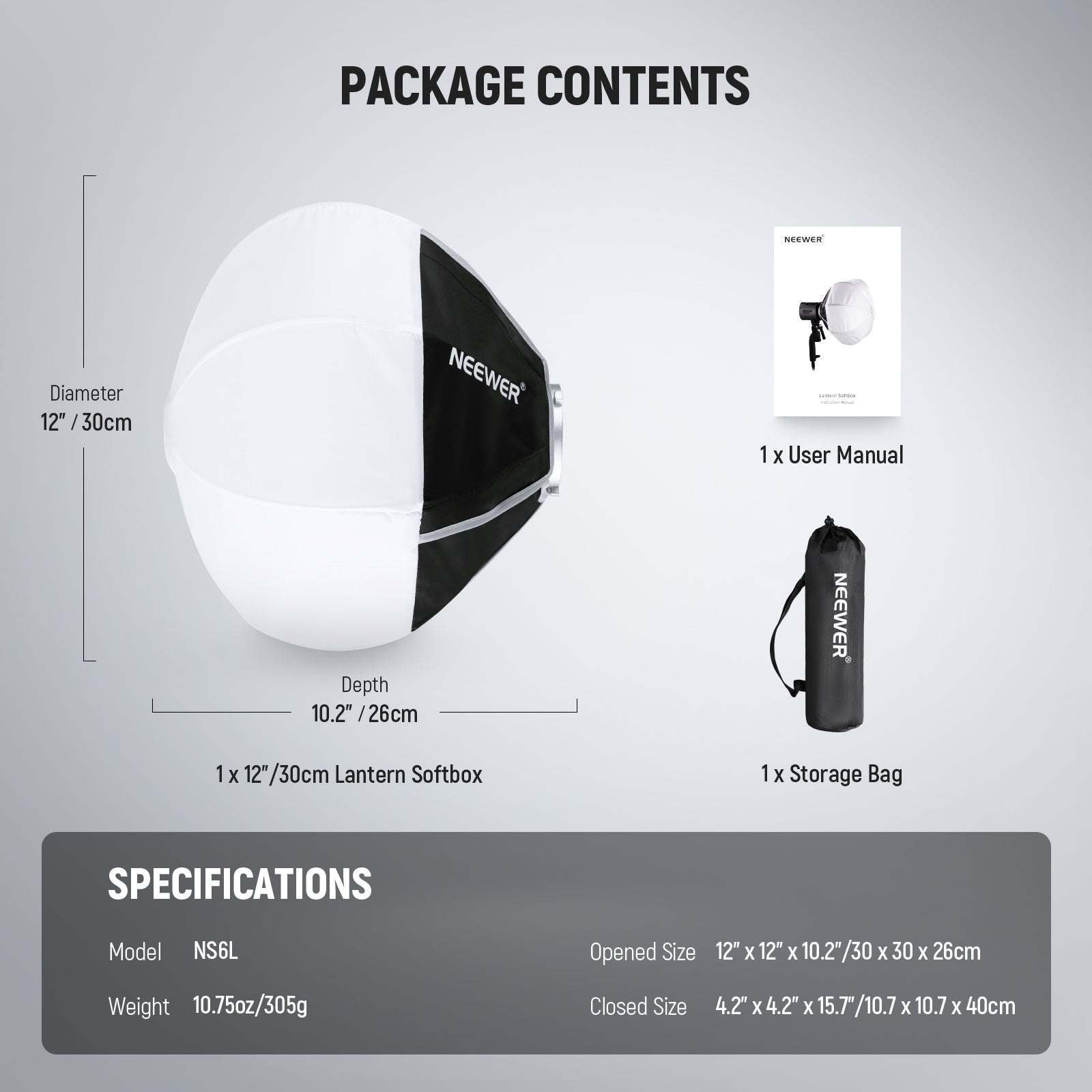• Lantern Softbox with NEEWER Mount- This 12"/30cm lantern softbox is only compatible with NEEWER MS60 MS60B MS60C MS150B mini LED video lights. Its compact size makes it an ideal choice for on the go outdoor handheld soft lighting setups, allowing for swift switches among NEEWER light modifiers and more accessories with NEEWER mount adapters (NOTE: It is not compatible with Bowens Mount Light.  )