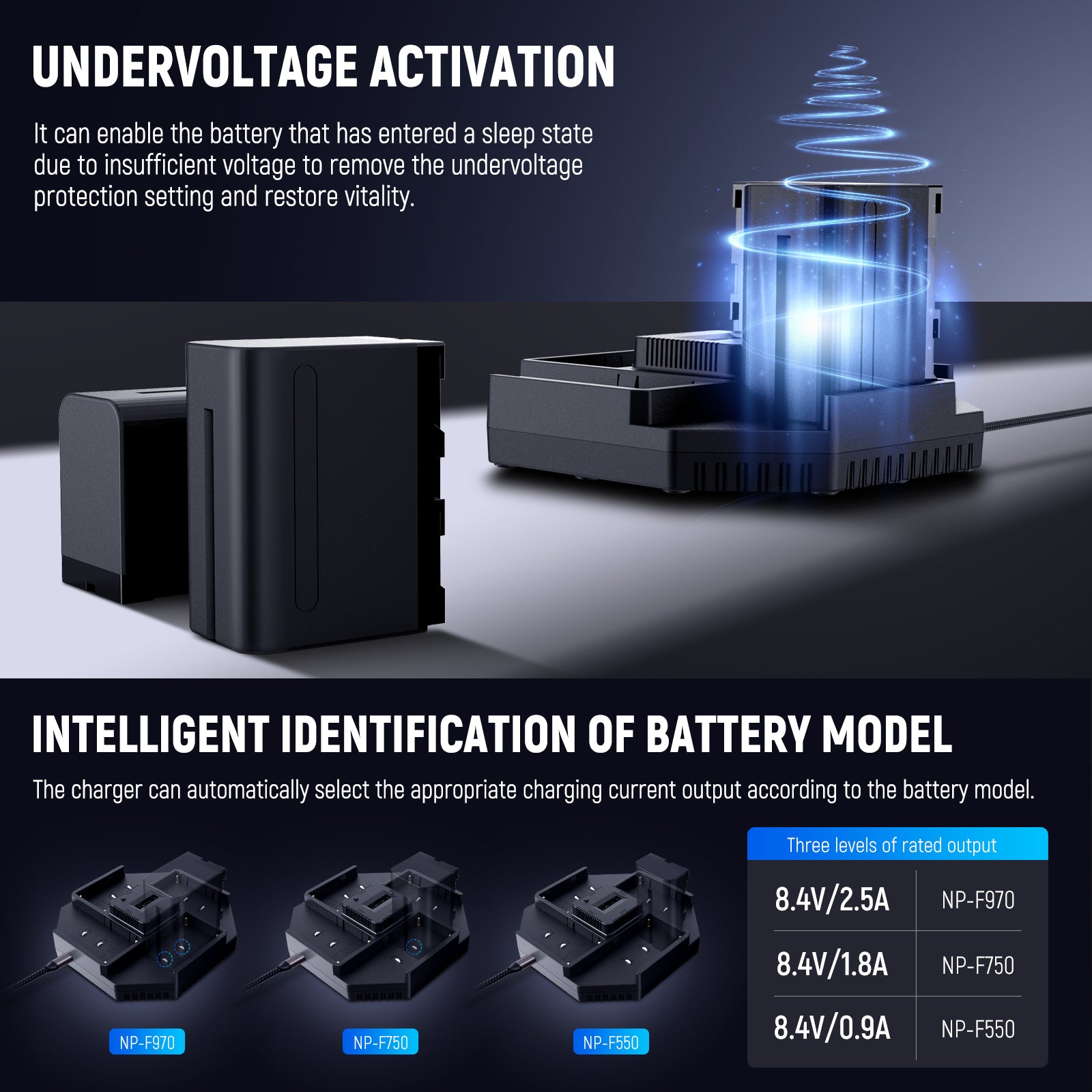 - Portable NP-F550 Battery Charger- The NW-F4 charger is compact and lightweight, weighing only 11.6oz/330g, easily slipping into your backpack or gear bag, providing a streamlined charging solution for your camera, camcorder, photography light NP-F batteries, etc. It features an undervoltage activation function, which will lift the undervoltage protection on batteries that have entered sleep mode due to low voltage, so as to restore their full performance