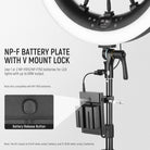 • Dual Channel NP-F to V Mount Battery Converter Adapter Plate- The NP-F battery plate with two channels can hold either one NP-F970 or NP-F750 battery for stand alone power supply or two of them to charge an LED video light, LED panel light, or ring light with a continuous lighting output of up to 60W. It features a battery lock for easy installation/removal and a side lock for V mount adapter detachment