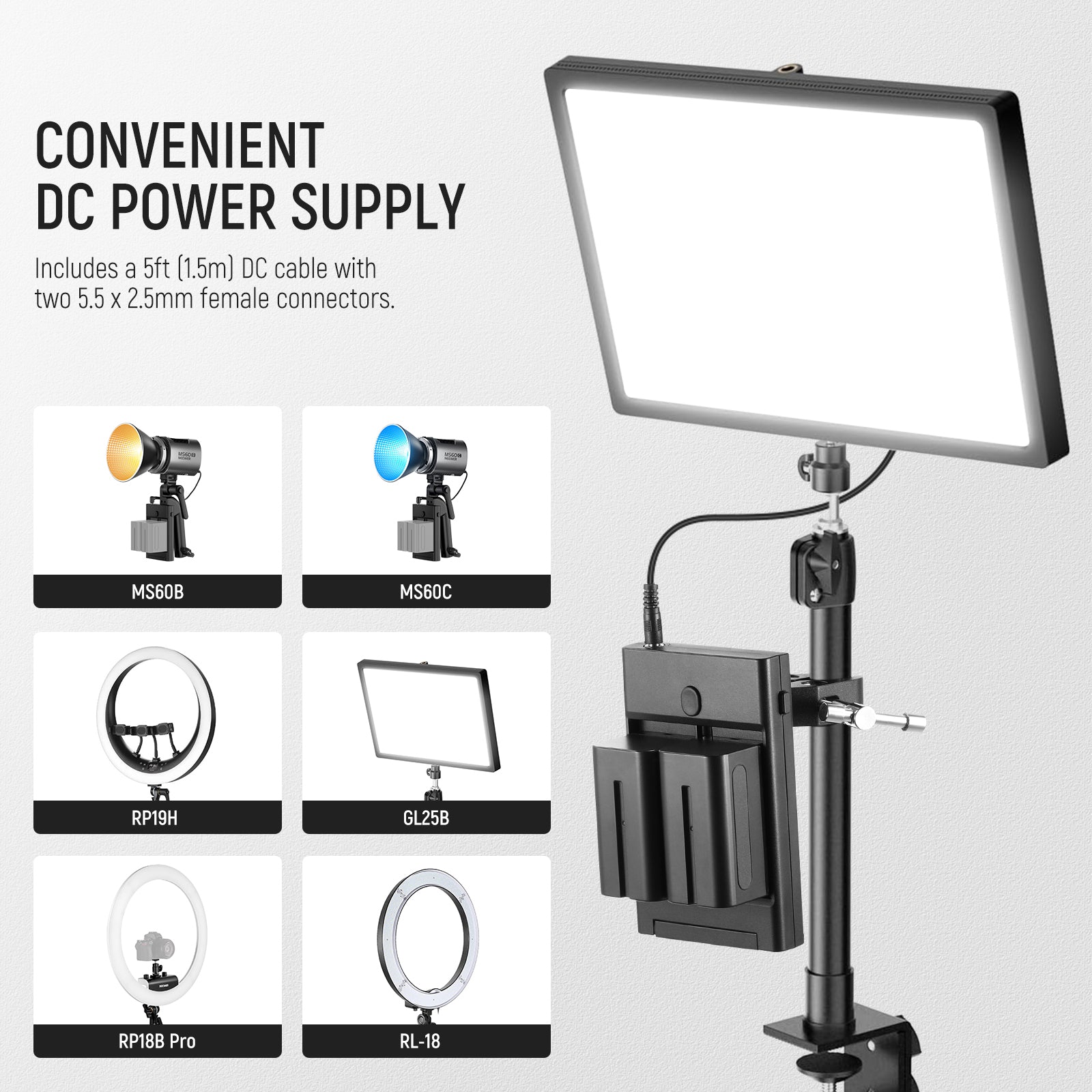 • Convenient DC Power Supply- Also includes a 5ft (1.5m) DC cable with two 5.5x2.5mm female connectors. It helps you connect the battery plate to a studio LED video light for power supply and allows you to move the light everywhere, compatible with Aputure AL-M9 compatible with Godox SL-60W compatible with ZHIYUN Molus G60 60W Pocket COB Light, and NEEWER 18 inch ring light MS60B MS60C 660 RGB660 and more