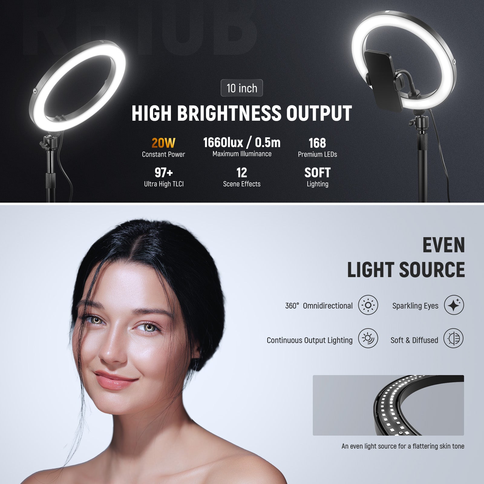 - Adjustable Desk Stand & 360° Lighting Angle- Our halo ring light for phones contains a desktop stand ranging 11"-18"/29-45cm and a 360° ball head. Easily tailor a desired height and optimal lighting angle. Versatile as makeup artists light, video recording light for YouTube Tiktok social media, streamer streaming light, webcam light for video conference, photo light for photography, video podcast light, Zoom call lighting for computer monitor, laptop light for video conferencing, etc.