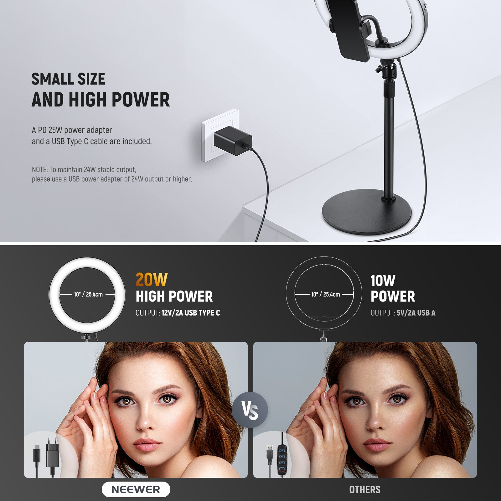 - 18W Bi Color Ring Light with PD 25W Charger- NEEWER 18W powerful LED ring light for desk boasts 144 LEDs (72 cool white & 72 warm white) provide bright, diffused, even light with up to 1380lux/0.5m illumination and high color fidelity with CRI95+/TLCI97+ to reproduce true to life colors. For phones, laptops, and computers, with fast charging to provide key or soft fill lighting for remote working, as content creator essential gear and influencer must have for photography and videography
