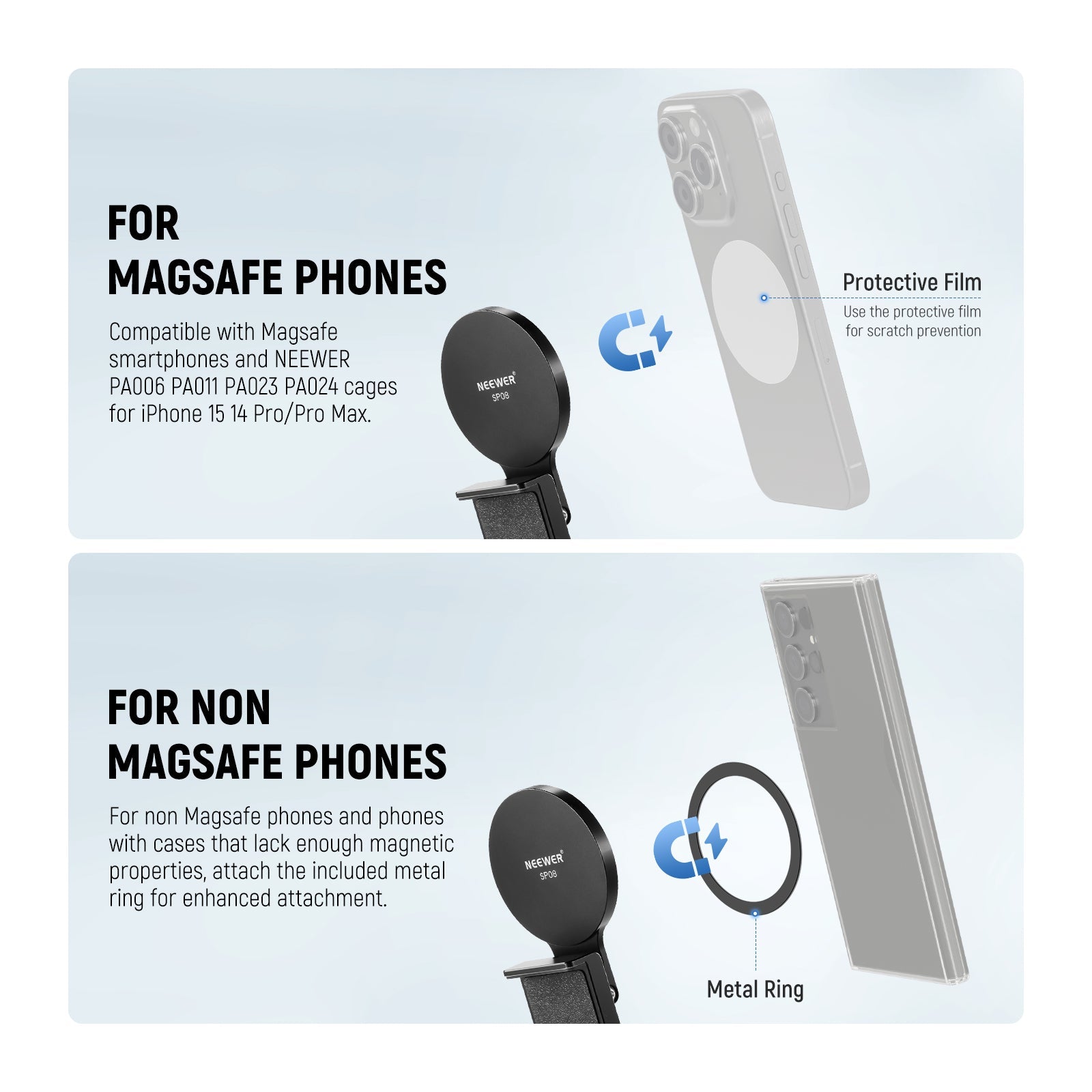 - Magnetic Phone Attachment- The phone camera holder is fully compatible with MagSafe system, and thus compatible with iPhone 15 Pro Max Plus 14 13 12 series, the MagSafe compatible phone case covers and NEEWER PA006 PA011 PA023 PA024 cages for iPhone 15 14 Pro and Pro Max. For non MagSafe phones, use the included magnetic ring for compatibility with Samsung Galaxy S24 S23 S22 Ultra Google Pixel 7 Pro Huawei, and more
