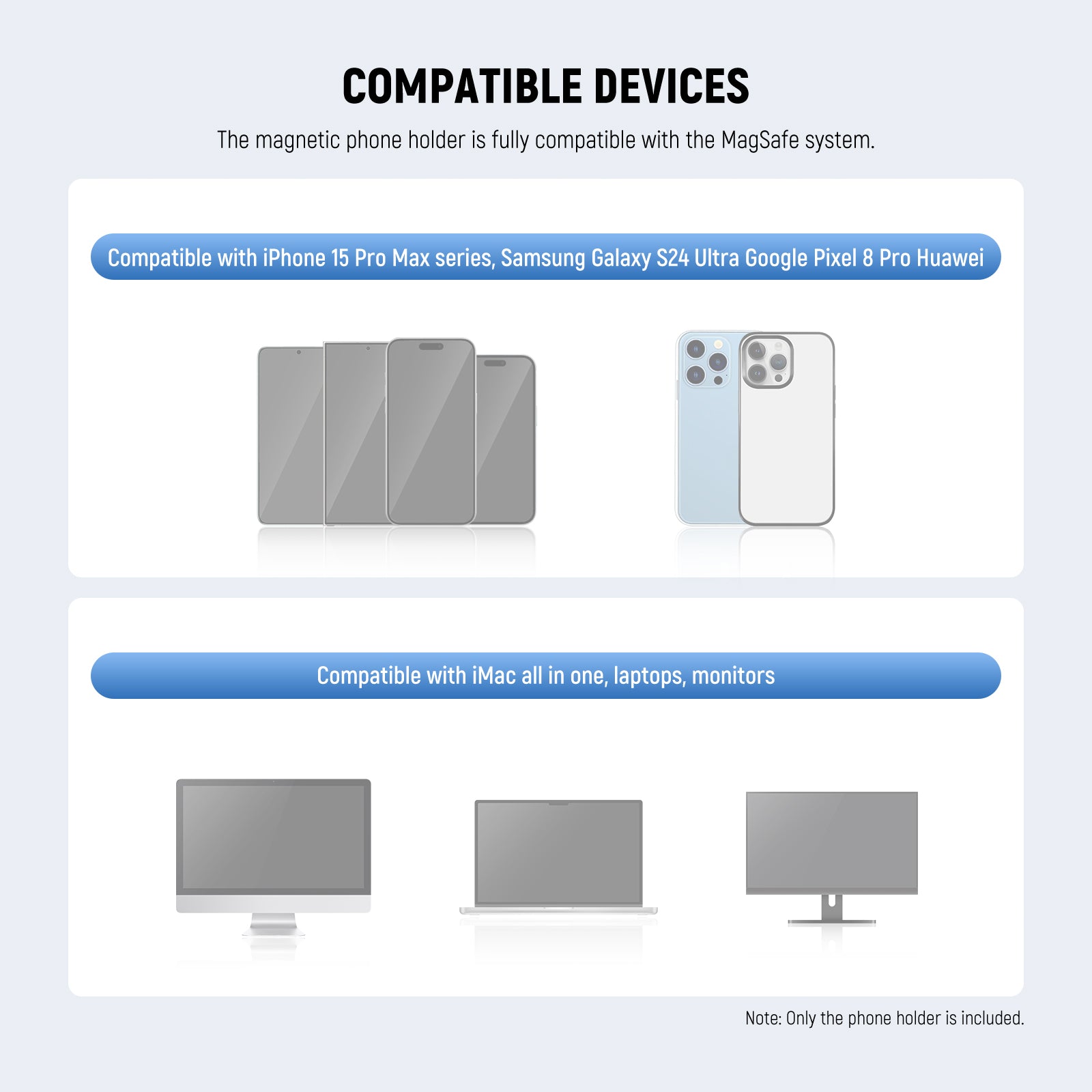 - Phone Camera Mount for Desktop Monitor- Use this continuity camera mount to attach your smartphone to the desktop display, monitor, laptop, or TV, versatile as a webcam mount compatible with Magsafe iPhone series compatible with Andriod smartphones compatible with Mac desktops and laptops compatible with iMac all in one computers compatible with Apple TV 4K and other screens, ideal for FaceTime, video conferencing, live streaming, and other content creation