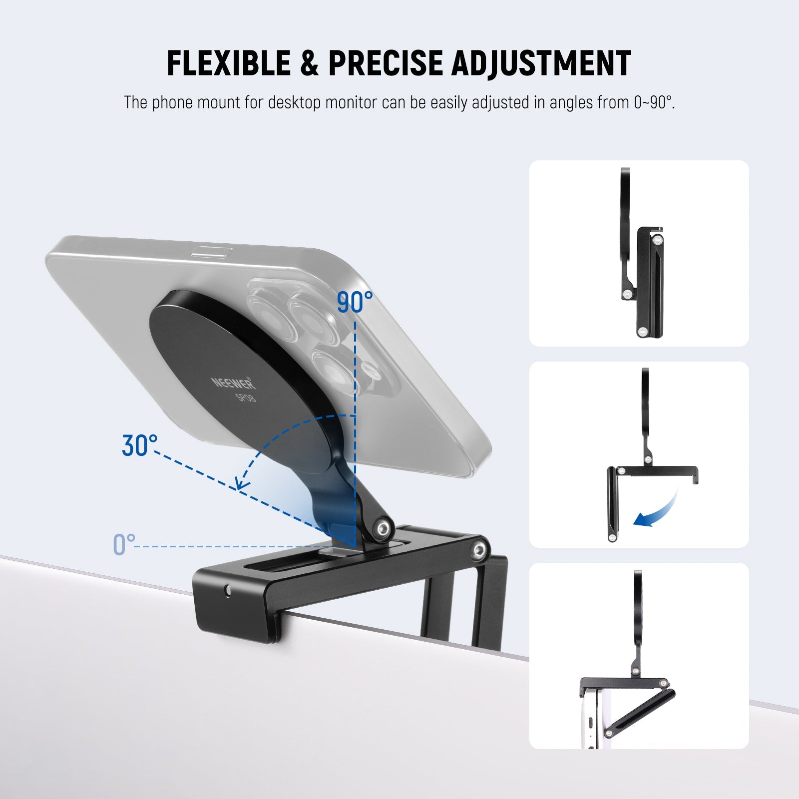 - Flexible & Precise Adjustment- The monitor phone mount provides effortless angle adjustment within a 0~90° range and allows for front to back positioning within a 1.65"/42mm range. With a simple slide, you can position the external camera higher or lower to capture shots and videos from your desired perspective