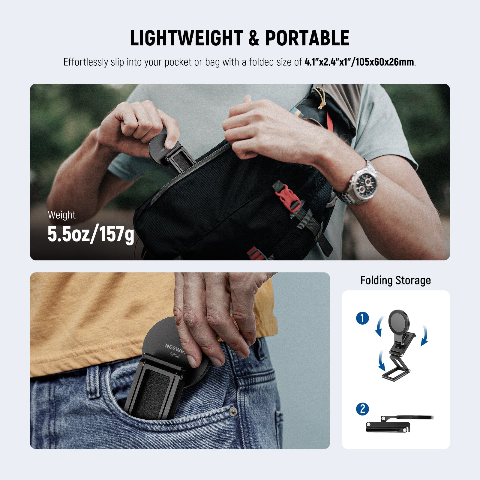 - Easy Setup & Compact Portability- With a simple pull or fold, you can switch the phone camera mount from suspension mode to desktop mode, catering to the diverse needs of photographers and videographers. Made of black anodized aluminum alloy, the all metal phone holder weighs only 5.5oz/157g but is sturdy to withstand wear and tear. Folding to 4.1"x2.4"x1"/105x60x26mm, this camera mount is easy to carry in your pocket for various shooting locations