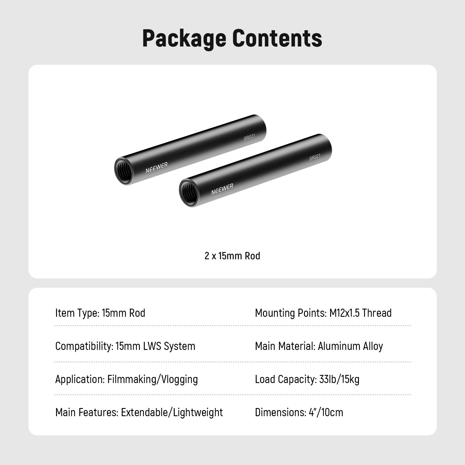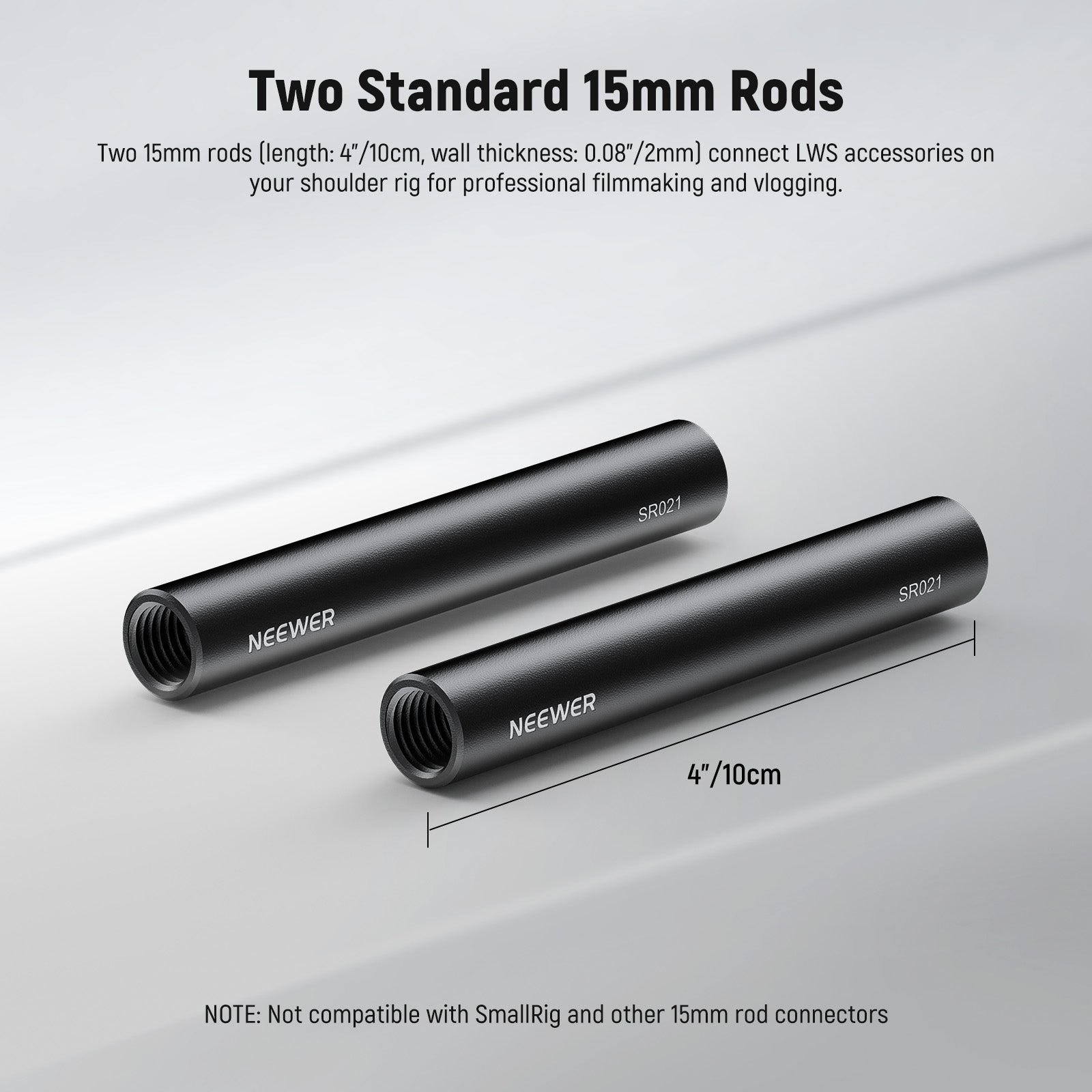 - Two Standard 15mm Rods- Two 15mm rods (length: 4"/10cm, wall thickness: 0.08"/2mm) connect LWS accessories on your shoulder rig for professional filmmaking and vlogging. Compatible with SmallRig video rigs and compatible with NICEYRIG camera rigs