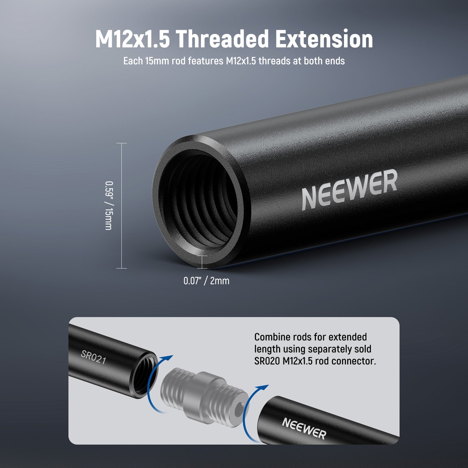 - M12x1.5 Threaded Extension- Each 15mm rod features M12x1.5 threads at both ends for length extension via the separately sold SR020 M12x1.5 Rod connectors. Not compatible with SmallRig and other 15mm rod connectors