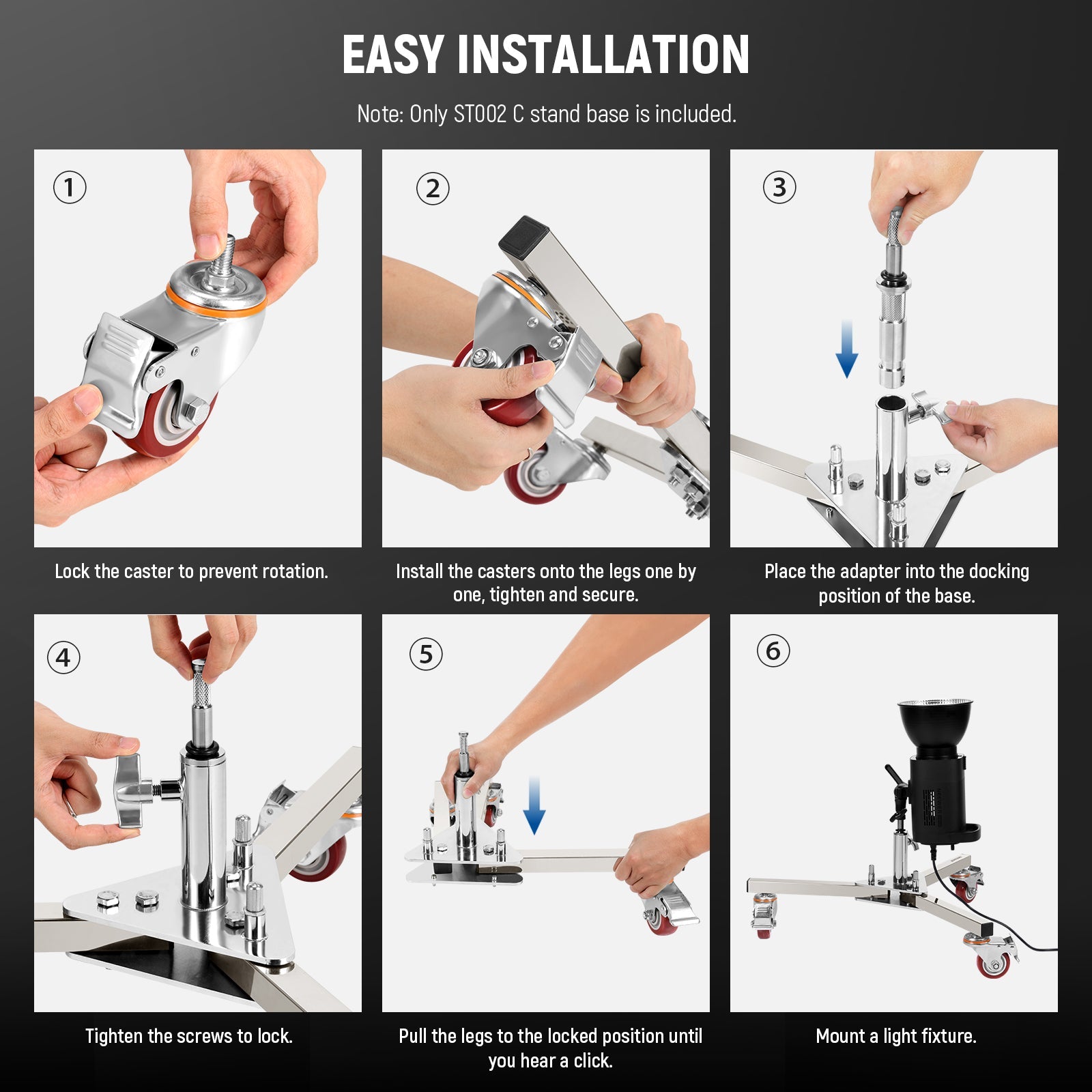 - 30"/75cm Large & Stable Rolling Stand Base- This heavy duty photography light stand base has a large footprint diameter of 30"/75cm in diameter to ensure maximum stability on the floor. The design of a steel pin locks the legs securely, preventing accidental folding during use and ensuring consistent performance