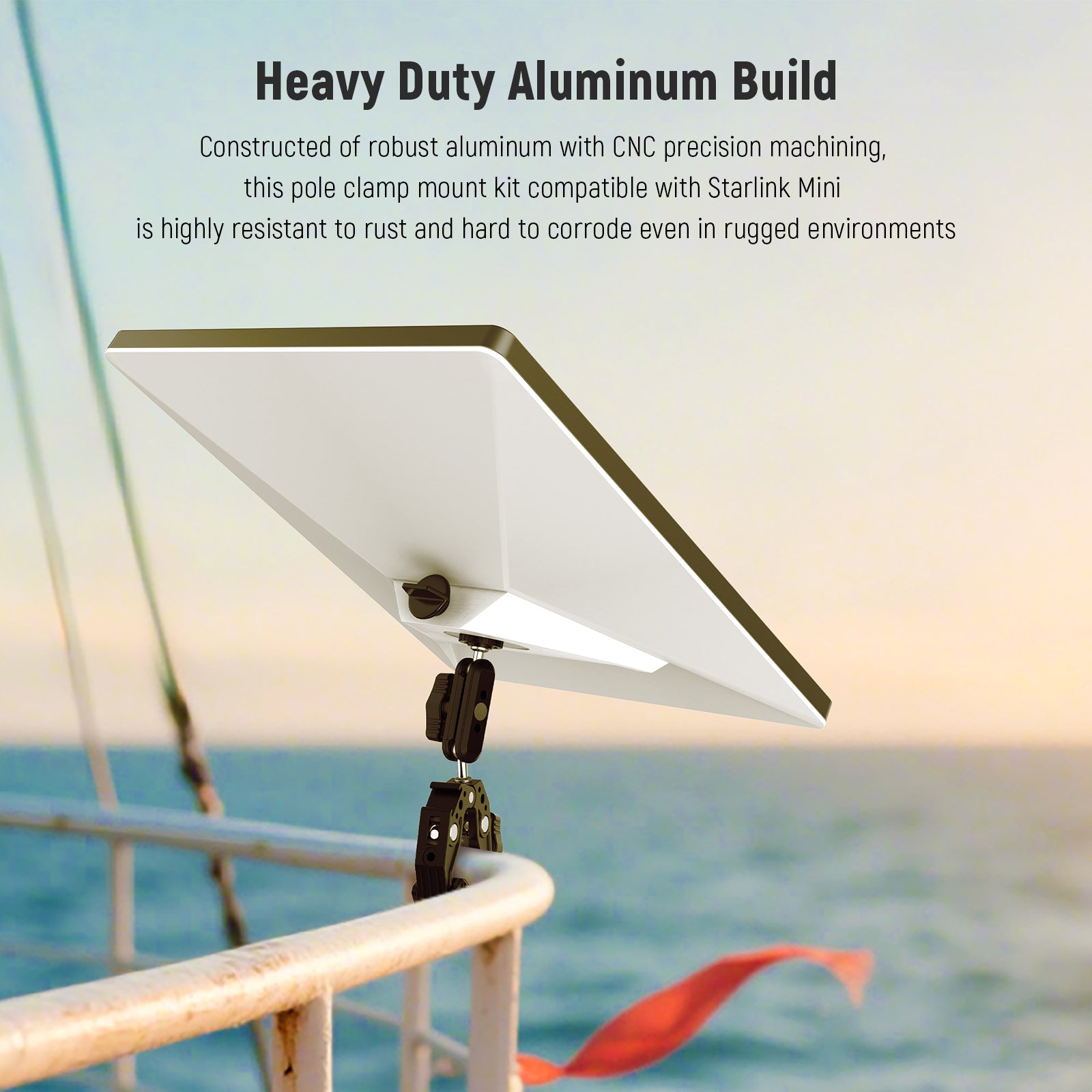 - Heavy Duty Aluminum Build- Constructed of robust aluminum with CNC precision machining, this pole clamp mount kit compatible with Starlink Mini is highly resistant to rust and hard to corrode even in rugged environments like campsites, RVs, or boats, making an ideal choice for temporary internet setups during outdoor adventures