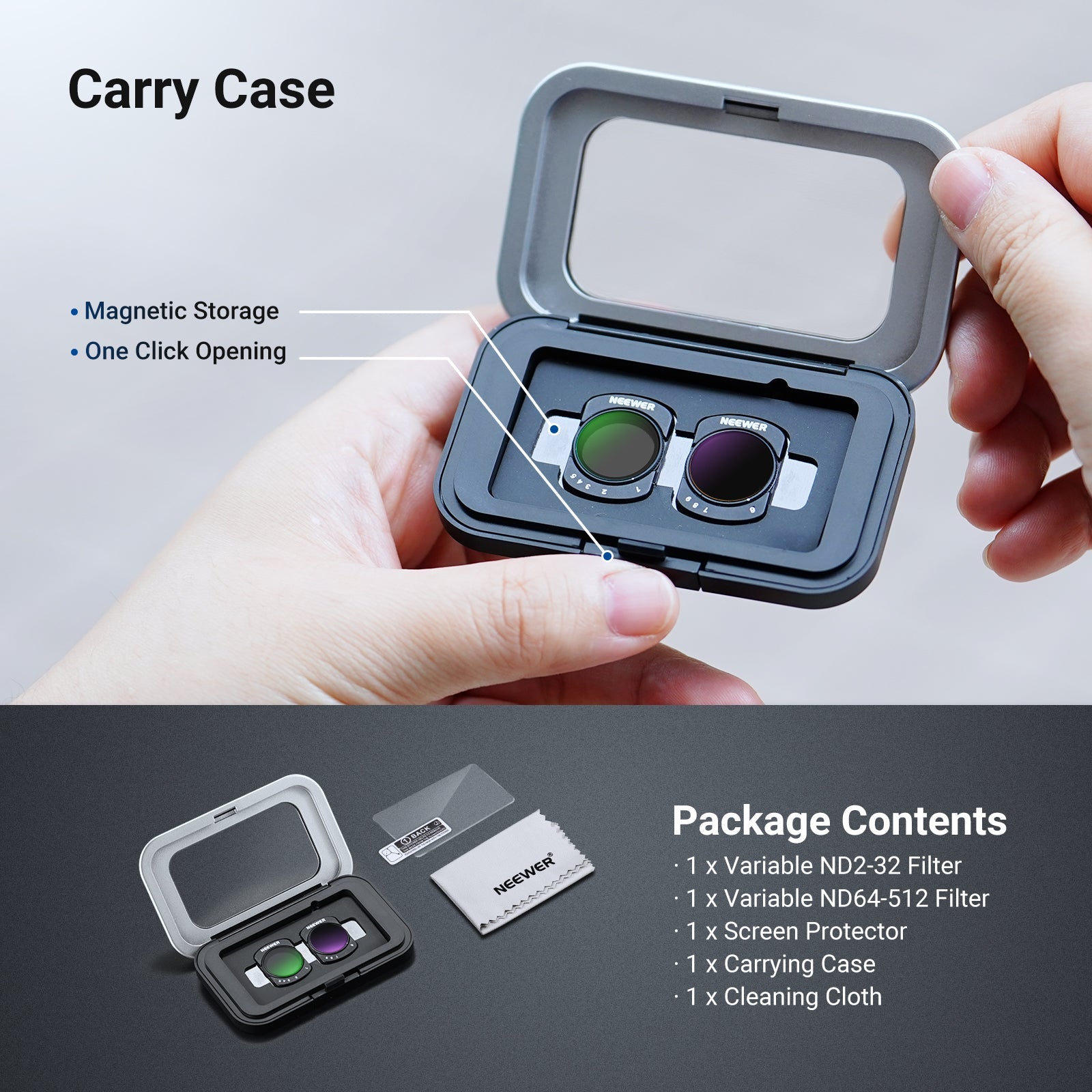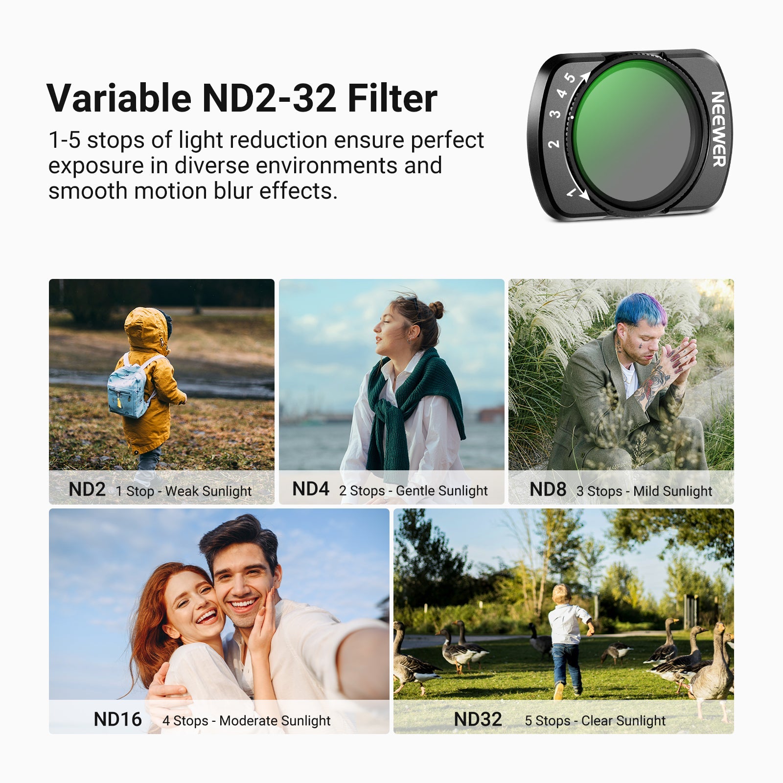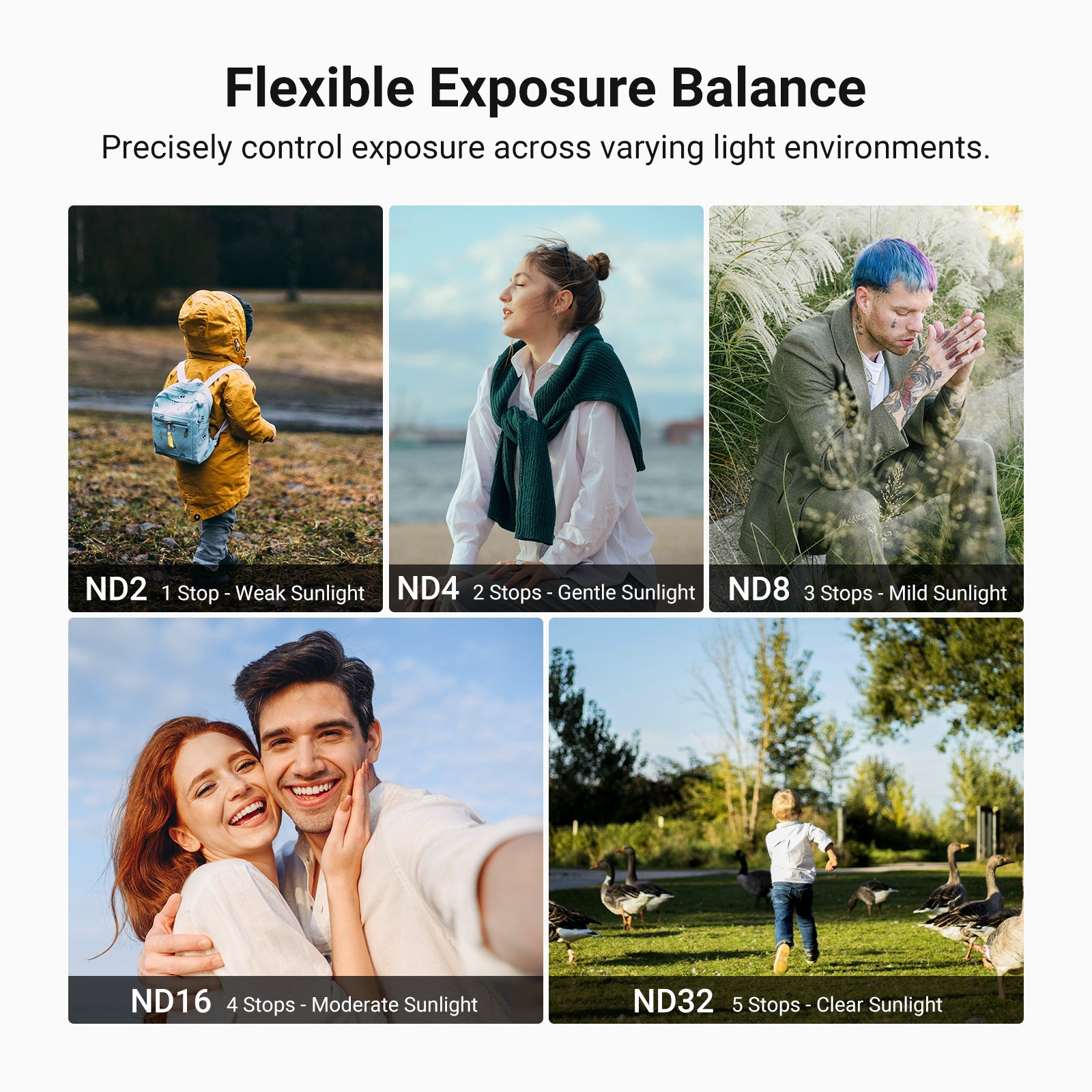 - Flexible Exposure Control- Variable ND2-32 and ND64-512 filters offer 1-5 and 6-9 stops of light reduction for exposure balance in different lighting conditions and dynamic motion blur effects. Rotate the frame to precisely adjust neutral density levels