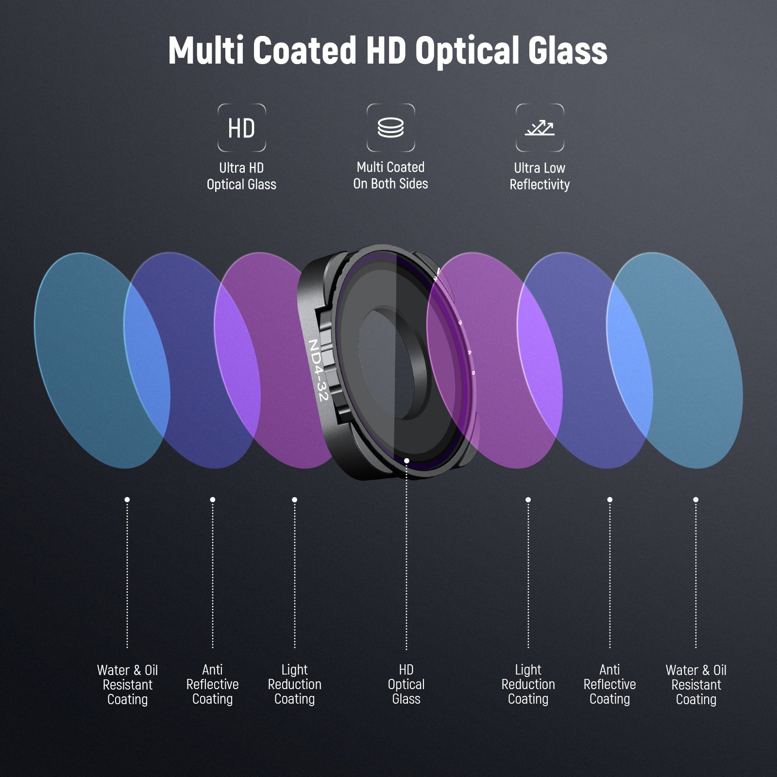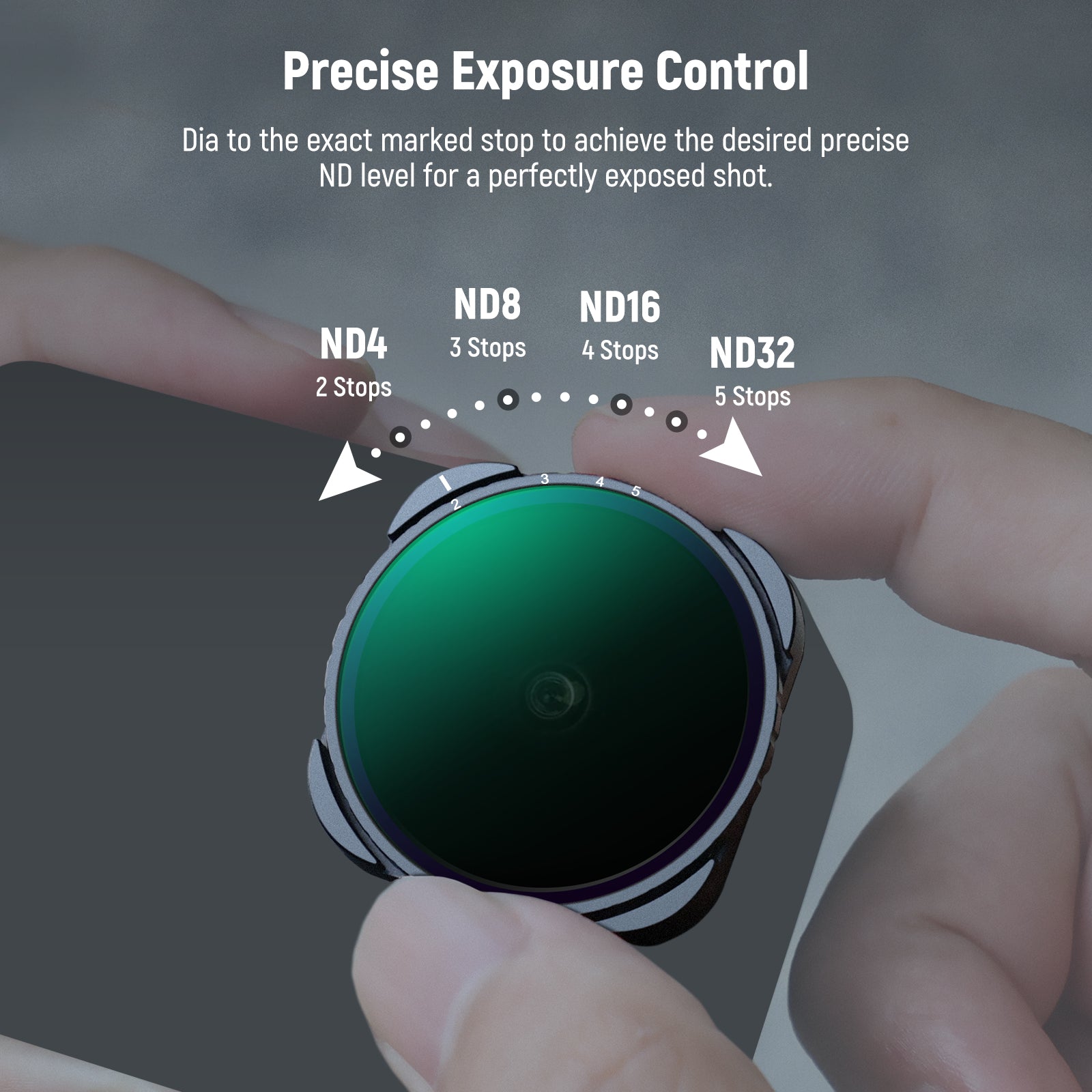 - Variable & Precise Light Control- Hard stops at both ends limit neutral density between ND4 and ND32 (2 and 5 stops). Simply rotate to the exact marked stop to achieve desired light reduction level for accurate exposure control and capture moving subjects with expressive motion blur effects