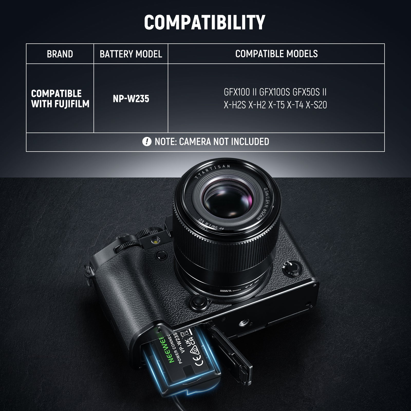 - Compatible Device Models- This dummy battery is a replacement battery for Fujifilm NP-W235, and is fully compatible with Fujifilm GFX100 II GFX100S GFX50S II X-H2S X-H2 X-T5 X-T4 X-S20 cameras