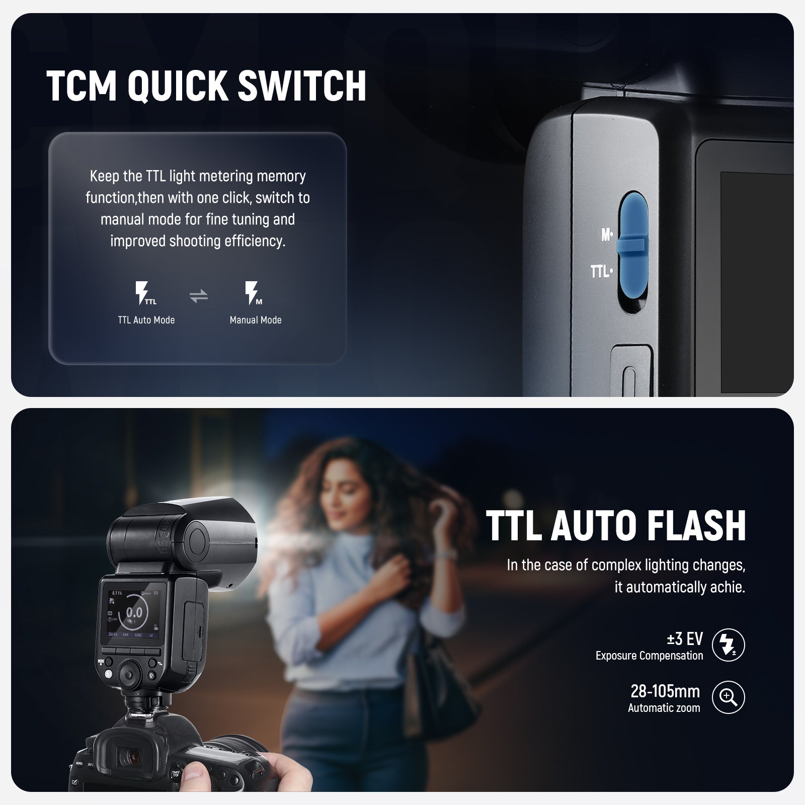 - Upgraded UI and TTL/M Mode Switch- This photography strobe light has an upgraded UI and a TCM key that switches from E-TTL to M mode in a second. The external flash speed light features automatic metering, 1/1-1/256 manual dimming, 28-105mm focal length, stroboscopic flashes, 1/8000s HSS, front/rear curtain sync, FEC/FEB (flash exposure compensation/bracketing), S1/S2 optical slave modes, and more. A firmware update is available via the USB Type C port
